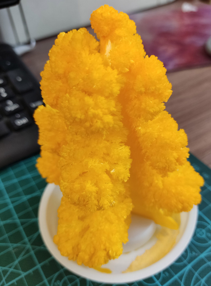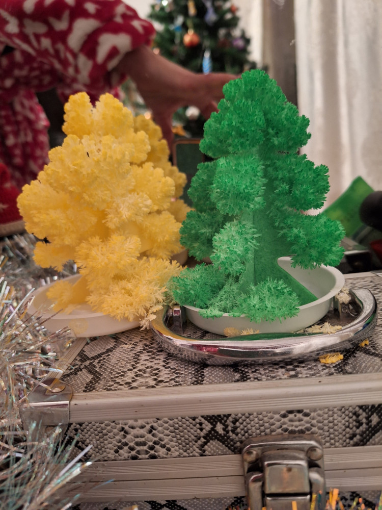 После того, как все осыпалось, собрали то, что осыпалось, долили воды и елка снова покрылась кристаллами. делали так несколько раз, кристаллов становилось меньше, но было интересно.