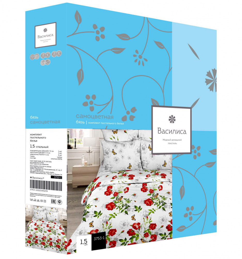 Комплект постельного белья создан из ткани бязь — гипоаллергенного, экологичного, высококачественного, крупнозакрученного волокна, благодаря чему эта ткань мягкая, нежная на ощупь и очень прочная, не образует катышков на поверхности. При соблюдении рекомендаций по уходу, это белье выдерживает много стирок (более 70), не линяет и не теряет свою первоначальную прочность. Бесшовное постельное белье «Василиса» — это высококачественный сертифицированный продукт.
