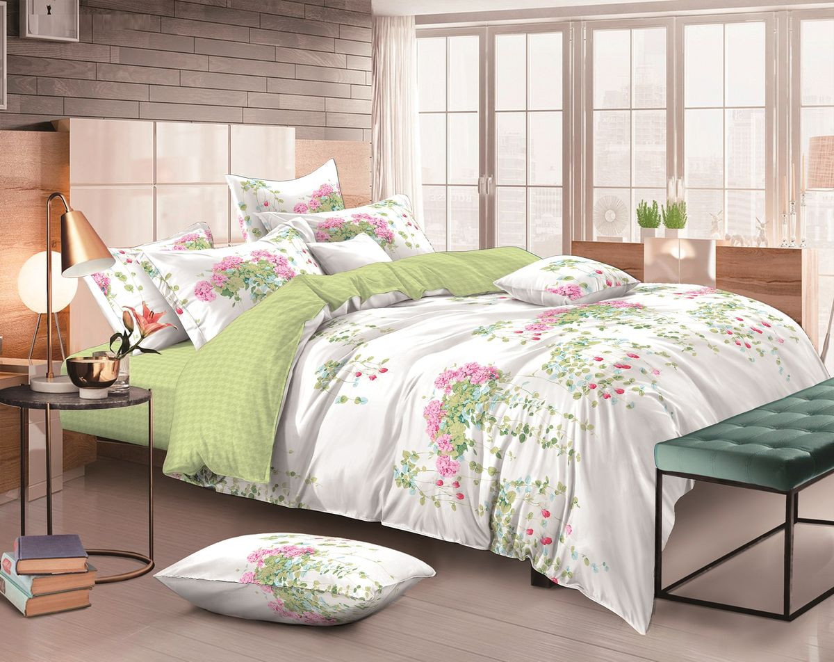 Постельное белье сшито из сатина — самого популярного плетения 100%-го хлопка. Сатин очень мягкий, износостойкий, который производят из крученой хлопковой нити по специальной технологии двойного плетения. Чем больше скручена нить, тем сильнее блестит ткань. Плотное переплетение нитей делает сатин премиум прочным и долговечным. Для производства сатина используют только хлопок высшего качества. Белье из такой ткани выдерживает 200–300 стирок. Сатин дешевле, чем шёлк, но дороже, чем другие ткани из хлопка. Из него изготовляется красивое качественное бельё для повседневного применения.