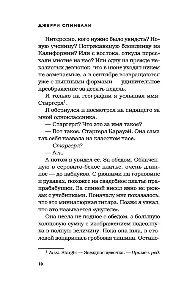 Серия: Young Adult. Коллекционируй лучшее В жизни шестнадцатилетнего Лео Борлока не было ничего интересного, пока он не встретил в школьной столовой новенькую. Девчонка оказалась со странностями. Она называет себя Старгерл, носит причудливые наряды, играет на гавайской гитаре, смеется, когда никто не шутит, танцует без музыки и повсюду таскает в сумке ручную крысу. Лео оказался в безвыходной ситуации — эта необычная девчонка перевернет с ног на голову его ничем не примечательную жизнь и создаст кучу проблем. Конечно же, он не собирался с ней дружить. Но разве его кто-то спрашивал? Старгерл выбирает друзей сама. |