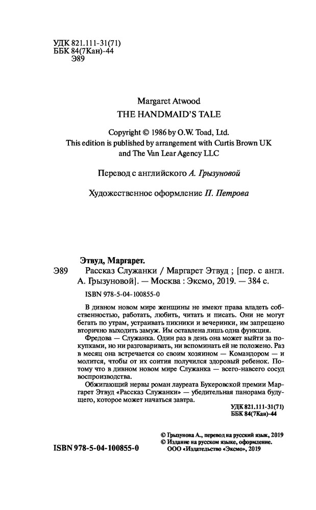Рассказ служанкиВ данный момент этот товар отсутствует в продаже. Возможно, у нас найдется аналогичный или похожий товар здесь. Серия: Экспансия чуда. Проза Маргарет Этвуд В дивном новом мире женщины не имеют права владеть собственностью, работать, любить, читать и писать. Они не могут бегать по утрам, устраивать пикники и вечеринки, им запрещено вторично выходить замуж. Им оставлена лишь одна функция. Фредова — Служанка. Один раз в день она может выйти за покупками, но ни разговаривать, ни вспоминать ей не положено. Раз в месяц она встречается со своим хозяином — Командором — и молится, чтобы от их соития получился здоровый ребенок. Потому что в дивном новом мире Служанка — всего-навсего сосуд воспроизводства. Обжигающий нервы роман лауреата Букеровской премии Маргарет Этвуд «Рассказ Служанки» — убедительная панорама будущего, которое может начаться завтра. |