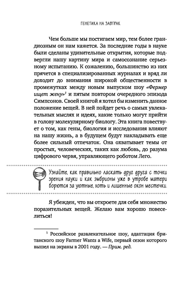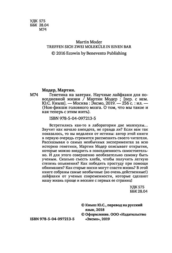 Генетика на завтрак. Научные лайфхаки для повседневной жизниВ данный момент этот товар отсутствует в продаже. Возможно, у нас найдется аналогичный или похожий товар здесь. Серия: Нон-фикшн головного мозга. О том, что мы такое и как теперь с этим жить Встретились как-то в лаборатории две молекулы... Звучит как начало анекдота, не правда ли? Если вам так показалось, то вы недалеки от истины: автор этой книги в первую очередь стремится рассмешить своего читателя. Рассказывая о самых необычных экспериментах за всю историю генетики, Мартин Модер описывает открытия, которые можно внедрить в повседневность самостоятельно. И для этого совершенно необязательно самому быть ученым. Сколько съесть хлеба, чтобы получить легкую степень опьянения? Как победить простуду при помощи обнимашек? Как старые носки могут спасти жизнь? В этой книге собраны самые необычные (но очень действенные!) лайфхаки от ученых современности, которые сделают вашу жизнь проще и веселее с первых ее страниц! |