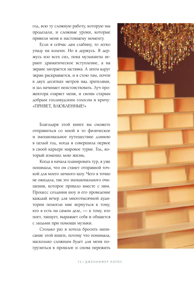 начала читать только вчера . ещё не дошла до конца,но уже успела получить огромное количество эмоции. показано что она такой же человек из плоти и крови , у нее такие же страхи как и у нас . во многих моментах вспоминала свой слезы и падения . но Дженнифер сильнее волей и шла только вперед. однозначно эта книга должна быть в коллекции каждой девочки . а я уверенна что еще много раз буду ее перечитывать . к слову качество книги тоже прекрасное . обычно я скептик к мягким обложкам НО здесь и сама обложка и сами страницы шикарно выполнены . а обложка в виде закладки очень удобно (у меня раньше таких не было) и сама Дженнифер Лопес для меня очень интересна так как находясь совершенно на другом континенте посреди Азии я ношу схожее имя )