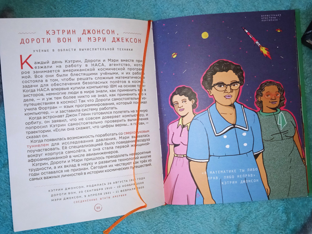 классная книга. моя дочь с удовольствием прочитала обе части, иногда перечитывает про особо полюбившихся героинь. хотелось бы такую же книгу про бунтарок центральной Азии. можно смело брать в подарок девочкам, сильно расширяет горизонты кем девочки могут быть. самое большое удивление дочи было в том, что где-то девочки не могут ходить в школу, оч много было вопросов на эту тему задано