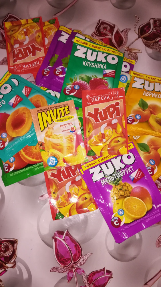 Заказала Зуко, Юпи и Инвайт. Все по своему хороши. Зуко на 1л разбавленный очень насыщенный вкус, прямо сок напоминает, разбавляла на 1.5л, мне понравился. Юпи тоже на 1.5л, как сок, понравился. Инвайт на 1.5л напоминает лимонад, понравился. Вспомнили юность)) Муж набрал на вахту, чтобы просто воду не пить))