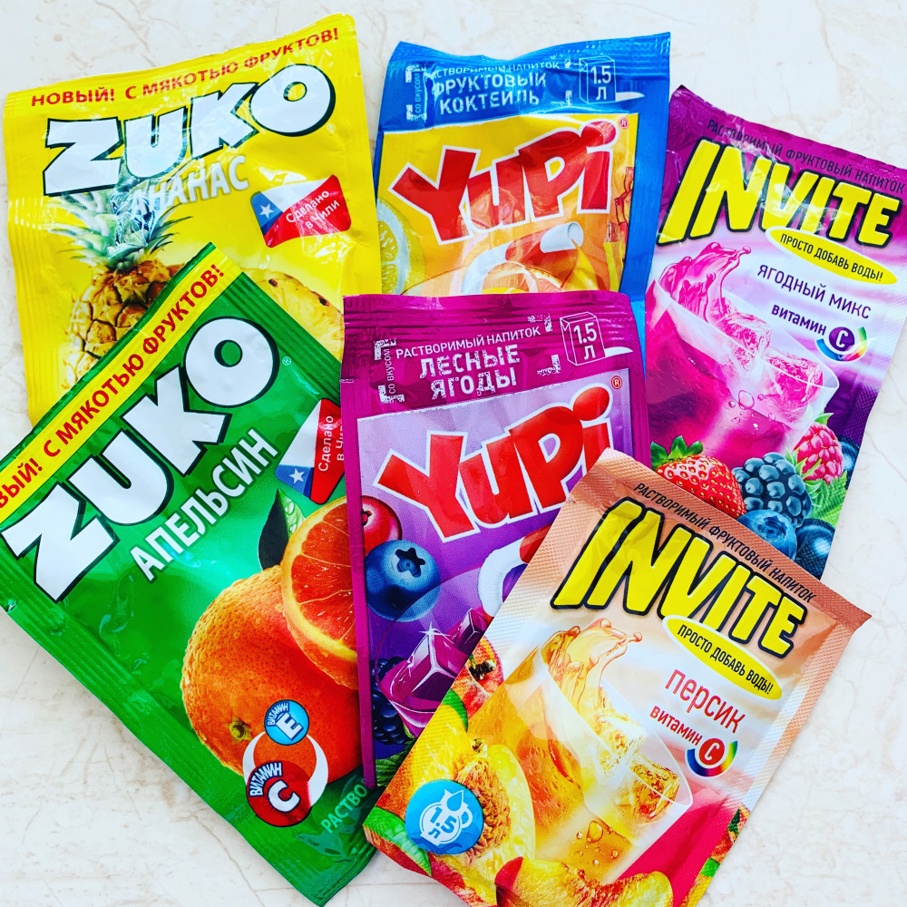 Заказала Зуко, Юпи и Инвайт. Все по своему хороши. Зуко на 1л разбавленный очень насыщенный вкус, прямо сок напоминает, разбавляла на 1.5л, мне понравился. Юпи тоже на 1.5л, как сок, понравился. Инвайт на 1.5л напоминает лимонад, понравился. Вспомнили юность)) Муж набрал на вахту, чтобы просто воду не пить))