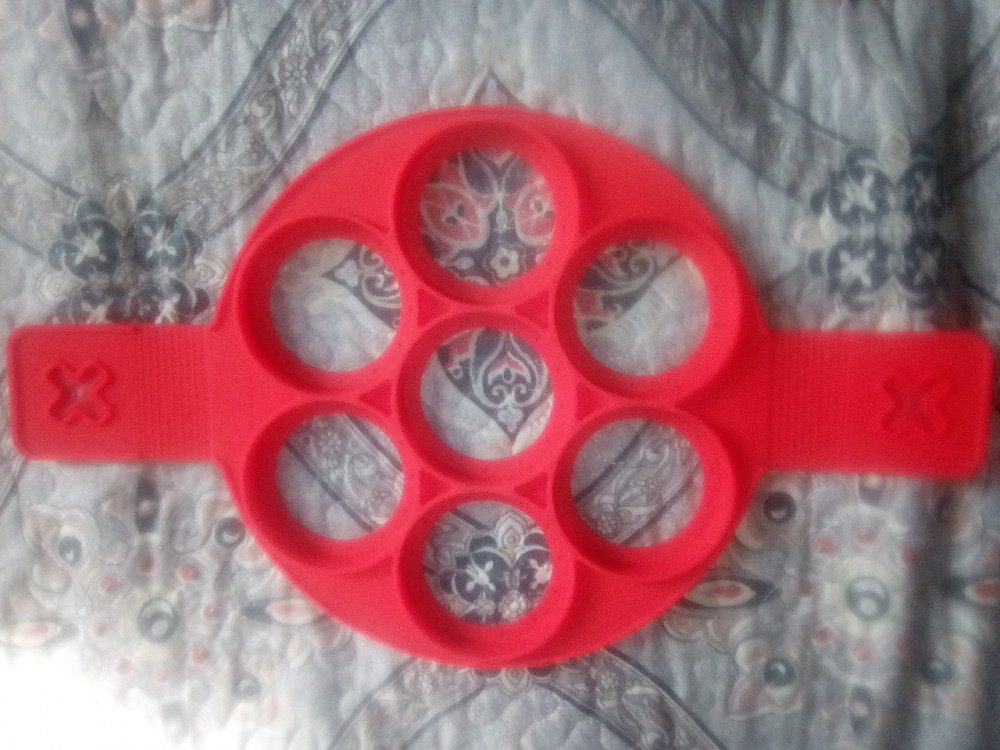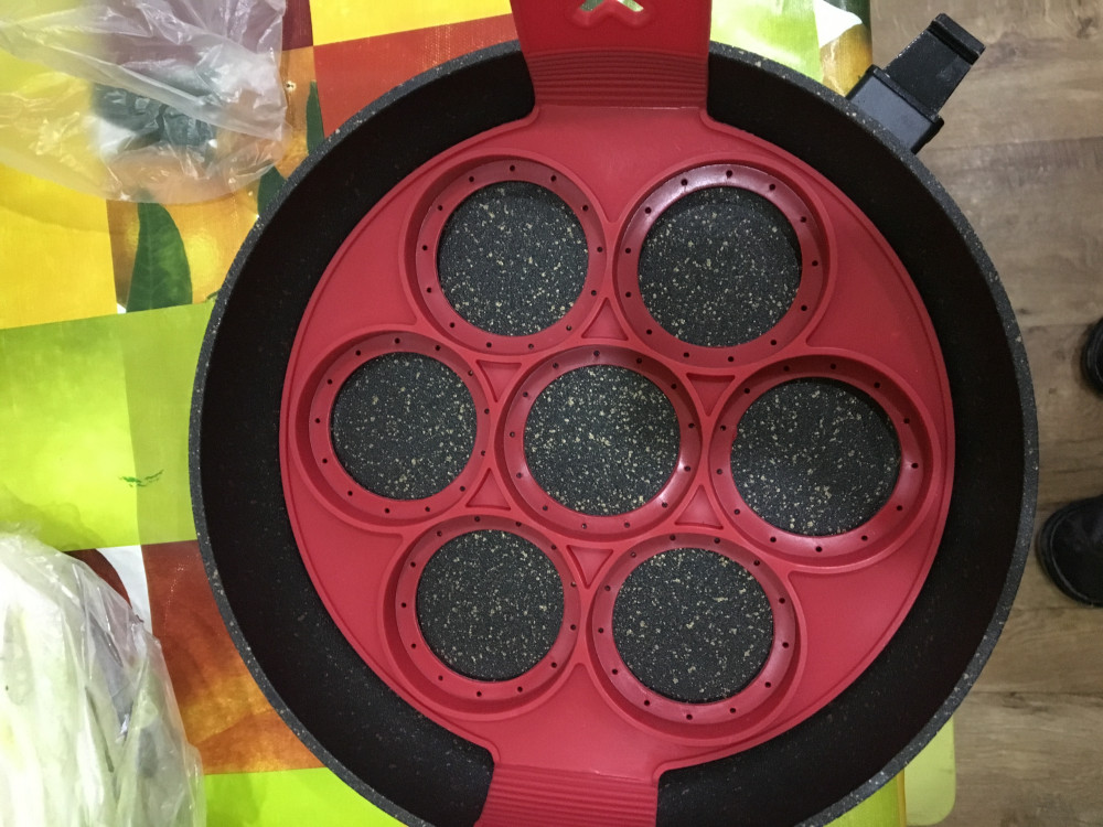 Эта форма вызвала у меня двоякое отношение: вроде бы красиво получается,но не удобно. Может со временем приспособлюсь ею пользоваться,но честно,проще было бы купить сковороду с углублениями,а так потратилась на форму,потом купила специально под нее сковороду,так как в мои сковородки она не помещалась.