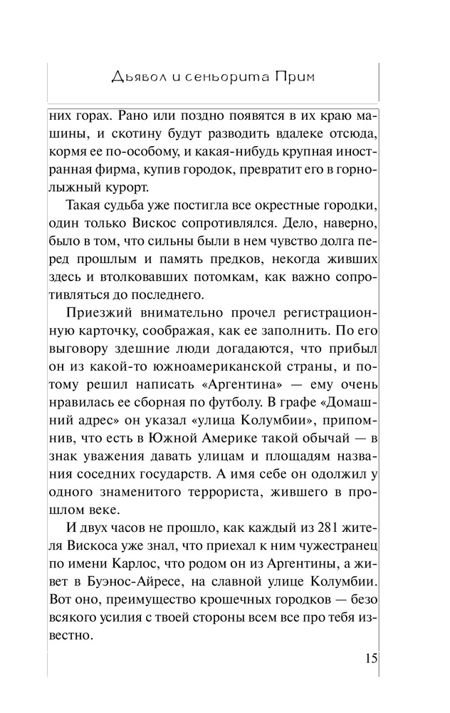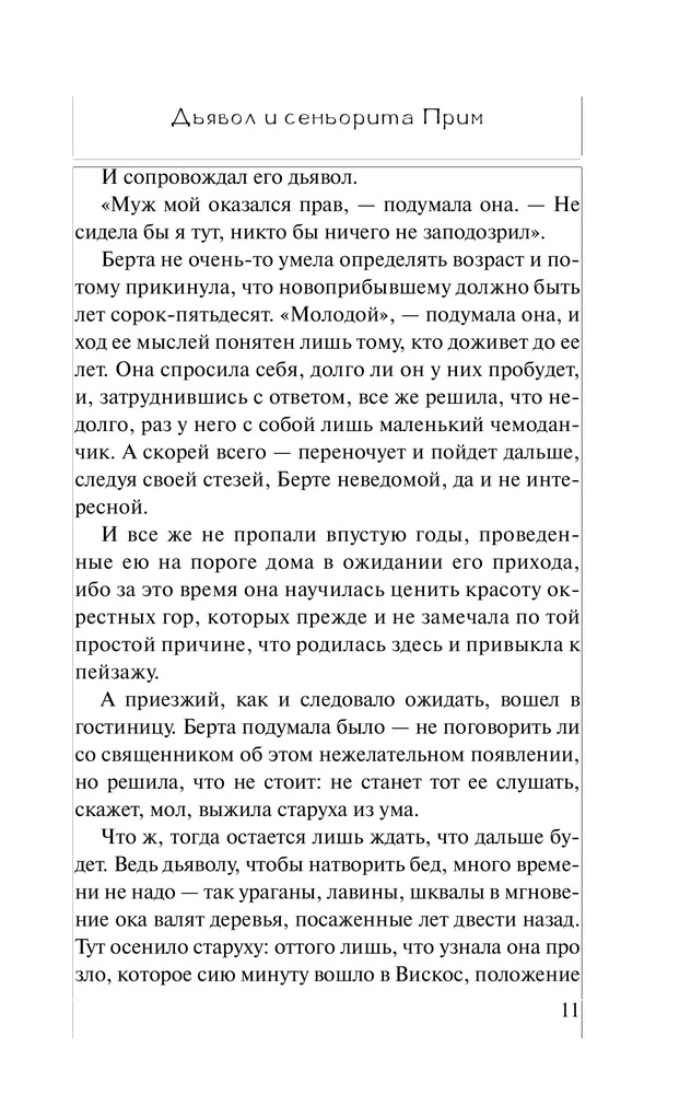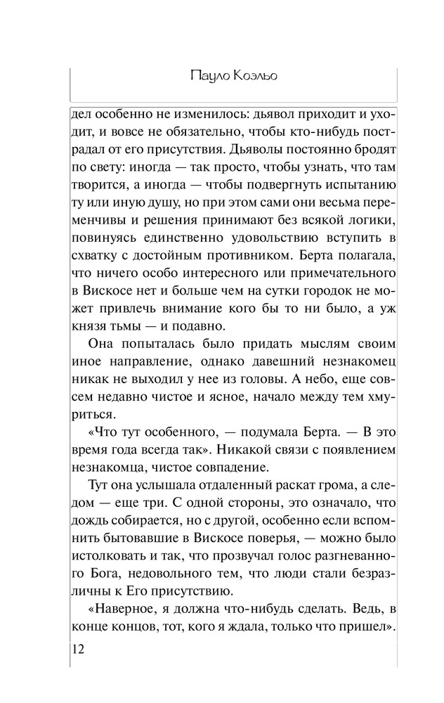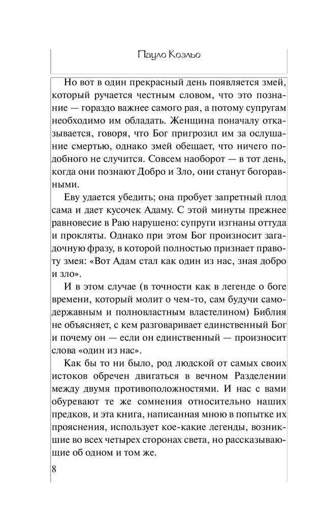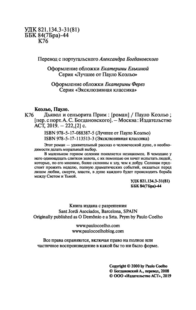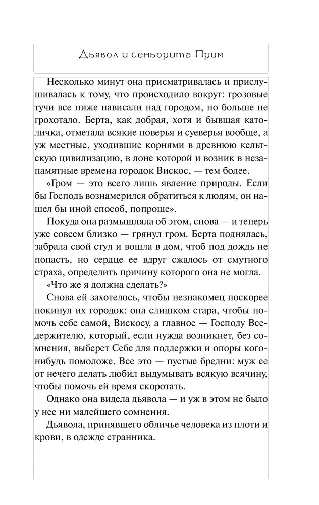 💳 Оплатить за товар можно при получении 🇰🇿 Есть бесплатная доставка по Казахстану 🎁 Копите бонусы с каждой покупки Серия: Эксклюзивная классика Этот роман — удивительный рассказ о человеческой душе, о необходимости делать моральный выбор. В маленьком горном селении появляется незнакомец. В чемодане у него одиннадцать слитков золота, с их помощью он хочет испытать людей, которые, по его мнению, более склонны к злу, чем к добру. Селянам предстоит прожить неделю, полную драматических событий, оказаться перед лицом любви, смерти, власти, в душе каждого будет происходить борьба между Светом и Тьмой. |
