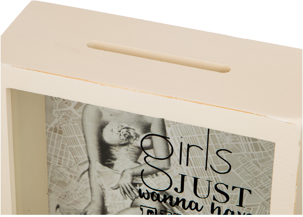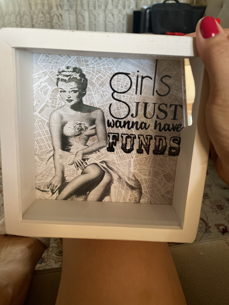 Копилка меня радует. Очень красивая. Можно закидывать и монеты и бумажные купюры. Из дерева. В общем, советую!!!