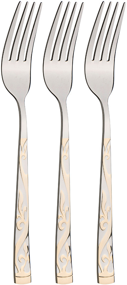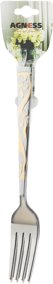 Ручки вилок украшены элегантным золотым узором, выполненным по технологии плазменного напыления и обеспечивающим высокую износостойкость покрытия. Красивый и элегантный набор столовых вилок Agness станет настоящим украшением любого праздничного или обеденного стола, а эстетичность столовых приборов удовлетворит запросы даже самых требовательных и взыскательных покупателей.