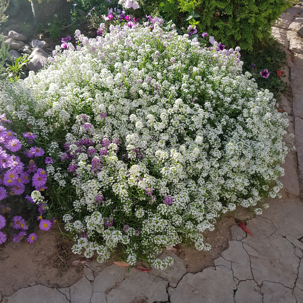 сейчас октябрь, алиссум прекрасен, летом мучался от жары, а осенью ему хорошо, в конце августа я его обстригла, и какую шапку он наростил.