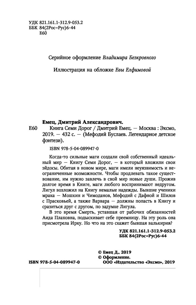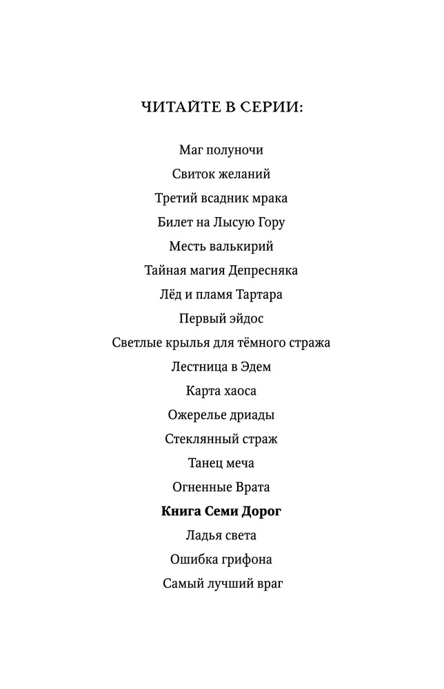Книга Семи ДорогВ данный момент этот товар отсутствует в продаже. Возможно, у нас найдется аналогичный или похожий товар здесь. Серия: Мефодий Буслаев. Легендарное детское фэнтези Когда-то сильные маги создали свой собственный идеальный мир — Книгу Семи Дорог, в который вложили свои эйдосы. Обитая в новом мире, маги имели неуязвимость и неограниченные возможности. Чтобы продлевать такое существование, им нужно завлечь в свой мир новые души. Прожив долгое время в Книге, маги любого воспринимают недругом. Лигул возложил на Книгу немалые надежды. Бывшие ученики мрака — Мошкин и Чимоданов, Мефодий с Дафной и Шилов с Прасковьей, а также Варвара должны попасть в Книгу и сразиться друг с другом по задумке Лигула. |