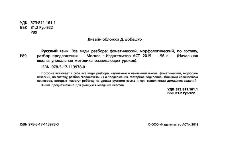 Русский язык. Все виды разбора: фонетический, морфологический, по составу, разбор предложенияВ данный момент этот товар отсутствует в продаже. Возможно, у нас найдется аналогичный или похожий товар здесь. Серия: Начальная школа: уникальная методика развивающих уроков Пособие включает в себя все виды разбора, изучаемые в начальной школе: фонетический, морфологический, по составу, разбор словосочетания и предложения. Материал подкреплён большим количеством примеров, которые помогут ребёнку на уроках русского языка и при выполнении домашних заданий. Книга предназначена для учащихся младших классов. |