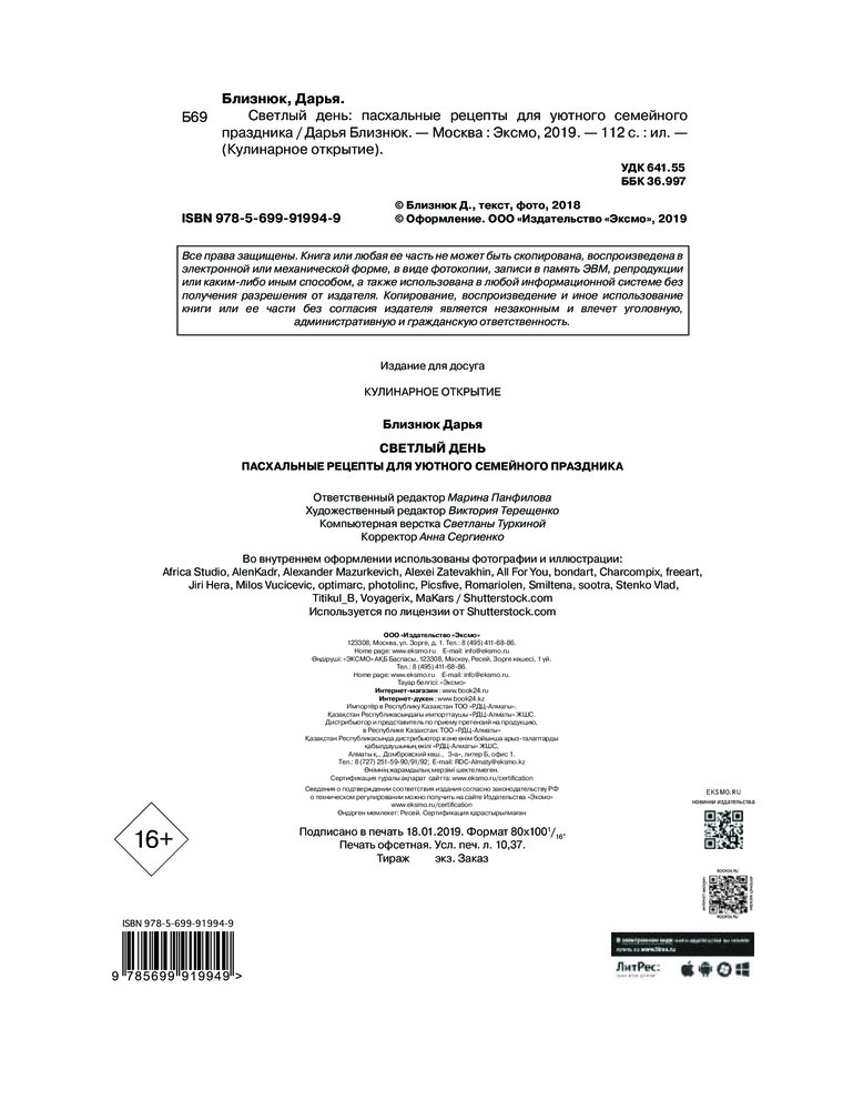 Книга очень понравилась. Рецепты из доступных продуктов. Сама книга оформлена красочно. Страницы гладкие. Основная идея книги это всевозможная выпечка. Кроме этого даны идеи по окрашиванию яиц и пара рецептов мясных блюд. Книга очень полезная. Прекрасно подойдет на подарок.