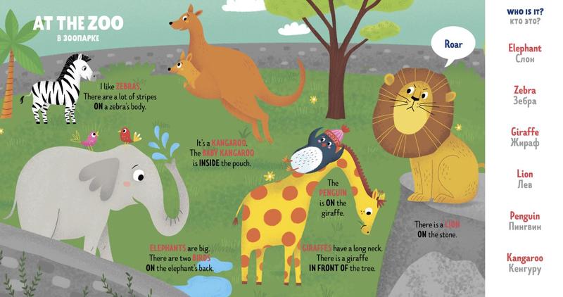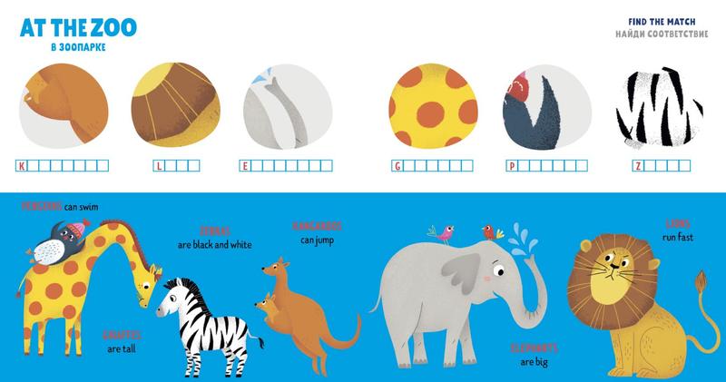 Хорошо и умно изданная книжка. Переплёт твёрдый, странички прочные. Изображения красочные. Сбоку страниц расположены слова, прочитав которые, надо найти соответствующую слову картинку. Имеется даже небольшой ребус "В зоопарке". В конце книги помещены рекомендации для родителей, как заниматься по этой книжке. Описаны некоторые игры по изучению английского языка.