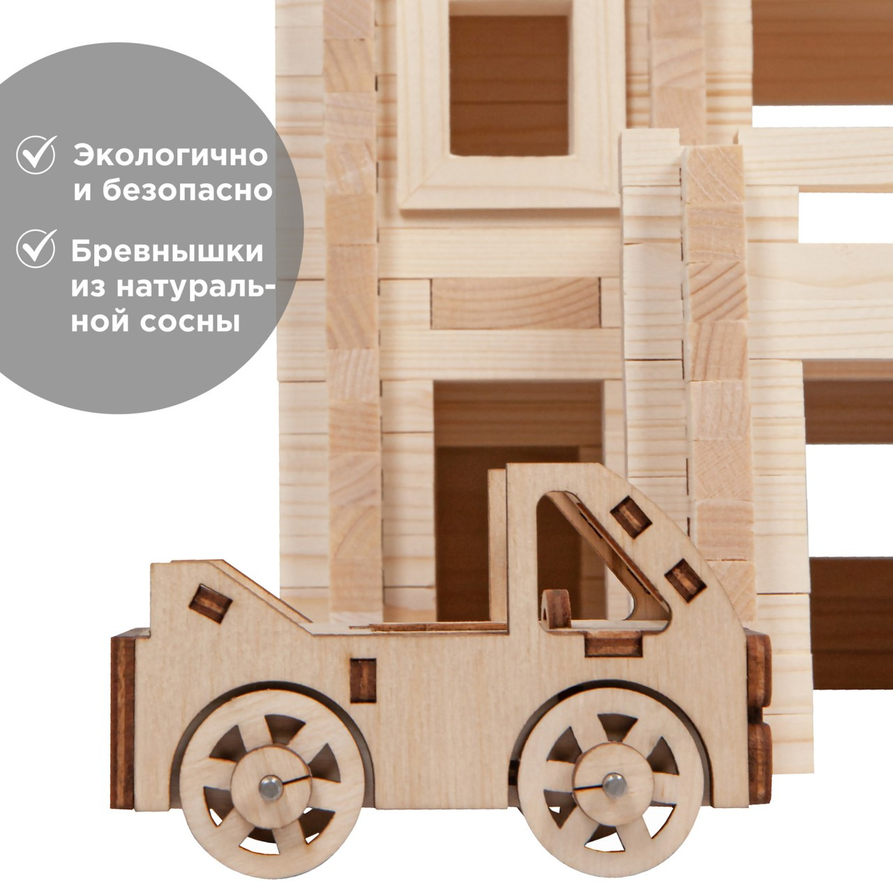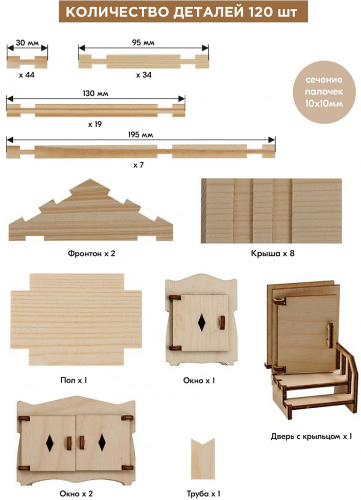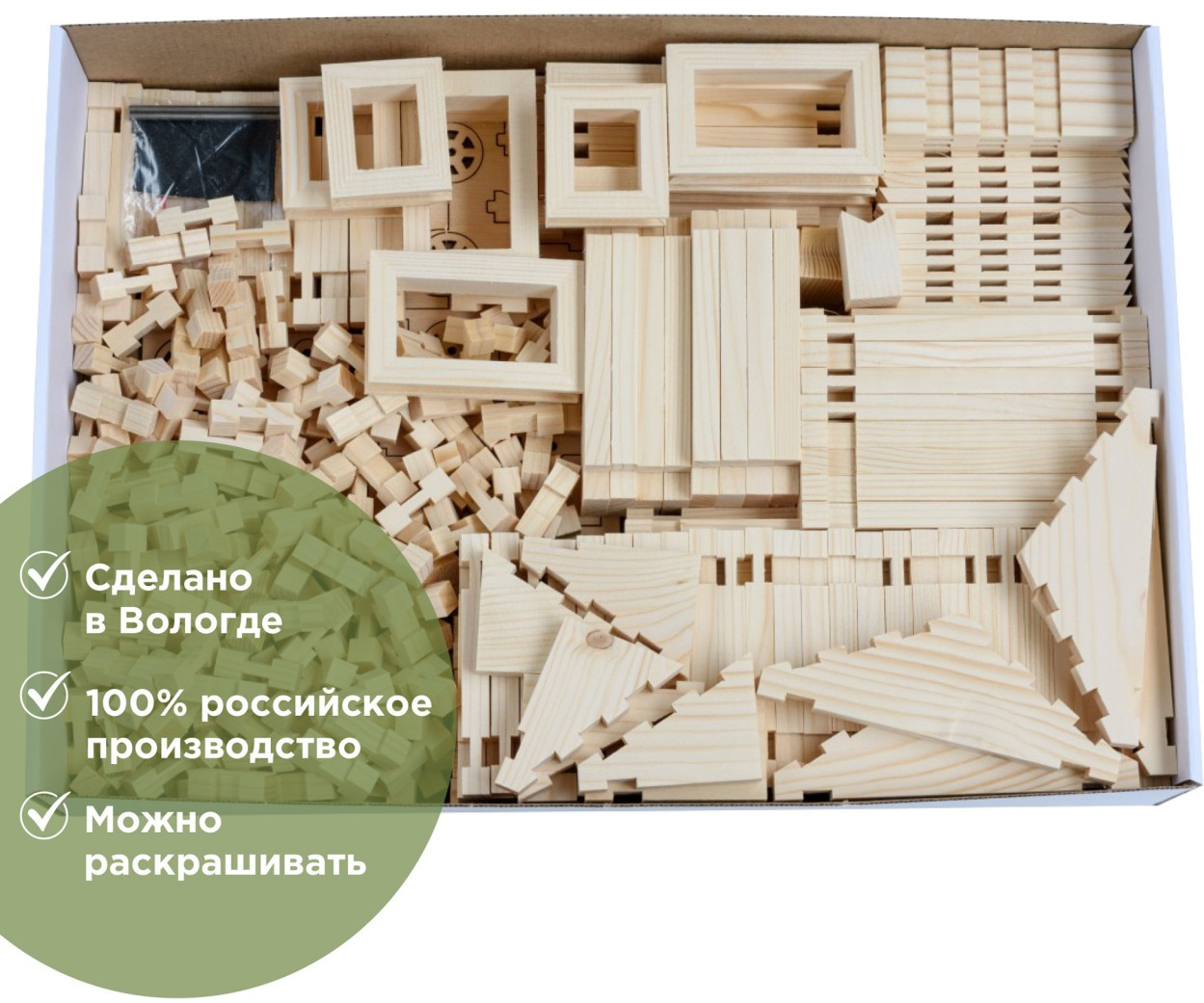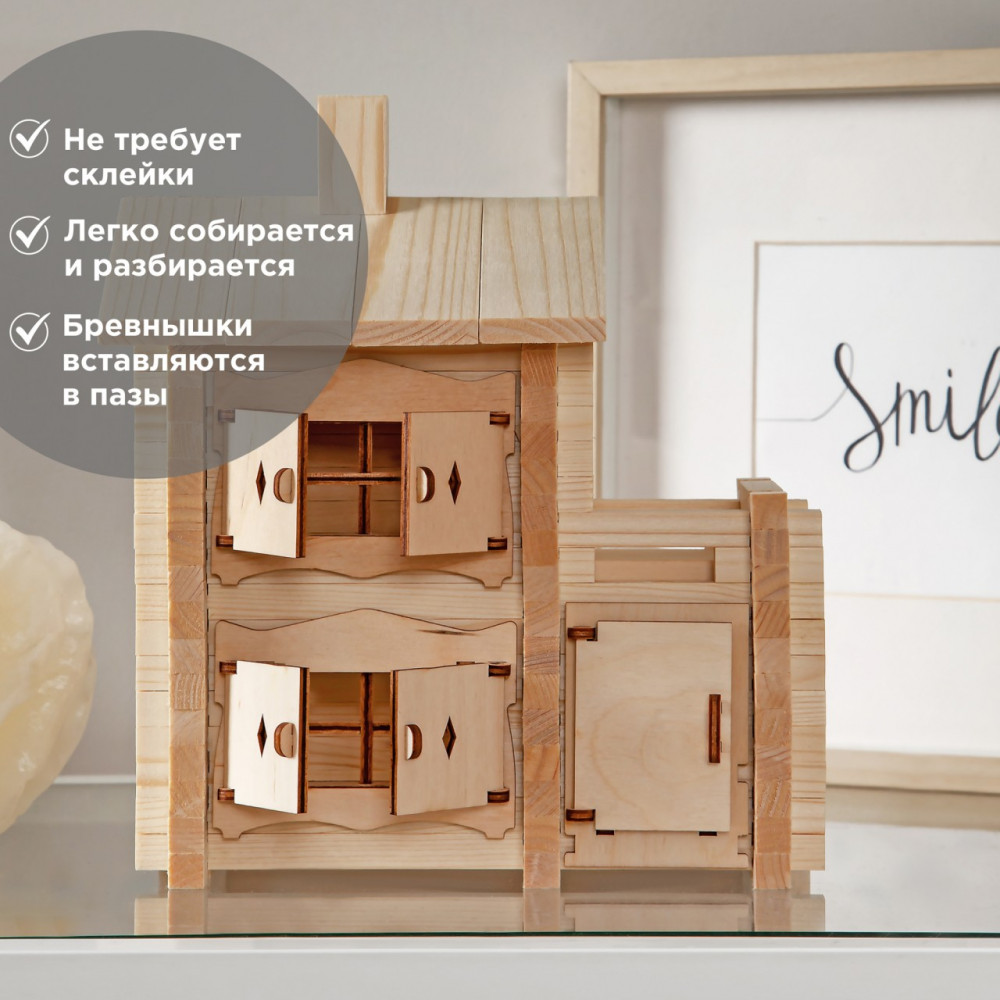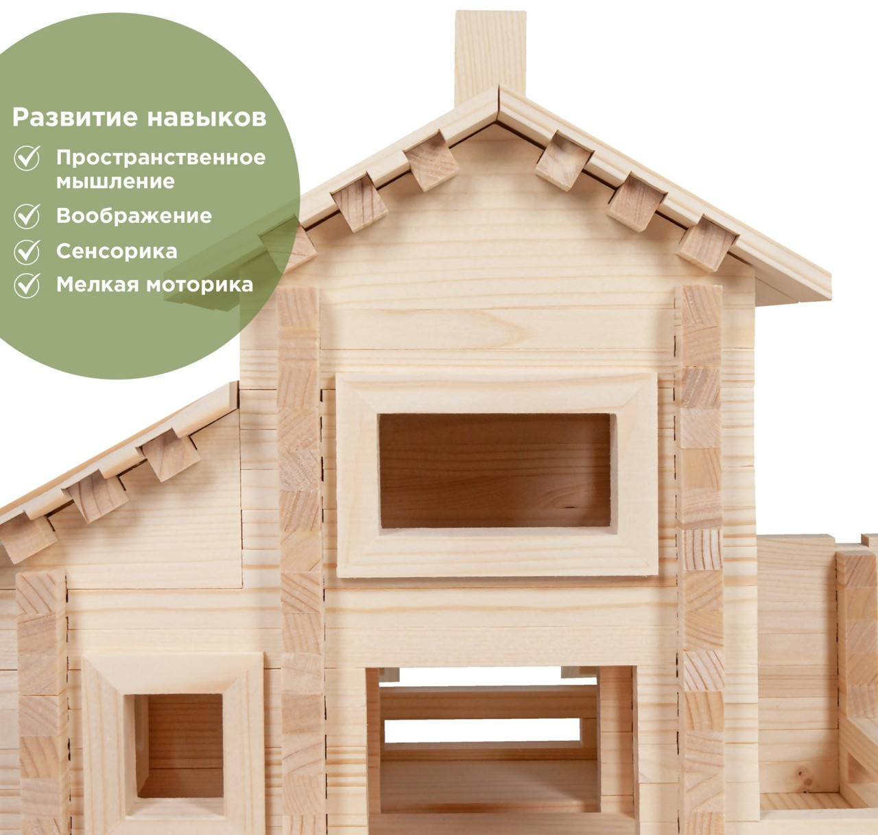 Из аккуратных сосновых брусочков и дополнительных частей часами собирать прелестные избушки с чердаками, покатыми крышами, террасами, верандами и дымоходами. Такое развлечение, требующее концентрации внимания и соблюдения инструкции, понравится даже истинным непоседам! Бревнышки, скаты крыш, фронтоны, окна, полы, труба — все детали тщательно обработаны и отшлифованы, чтобы обеспечить комфортную игру. Родители могут не беспокоиться о безопасности ребенка, но при этом он получит опыт работы с настоящим деревом.