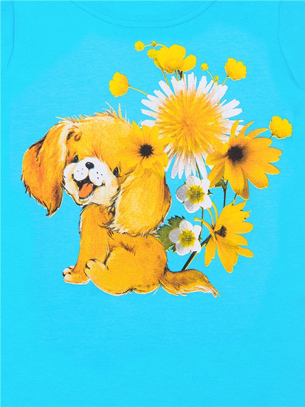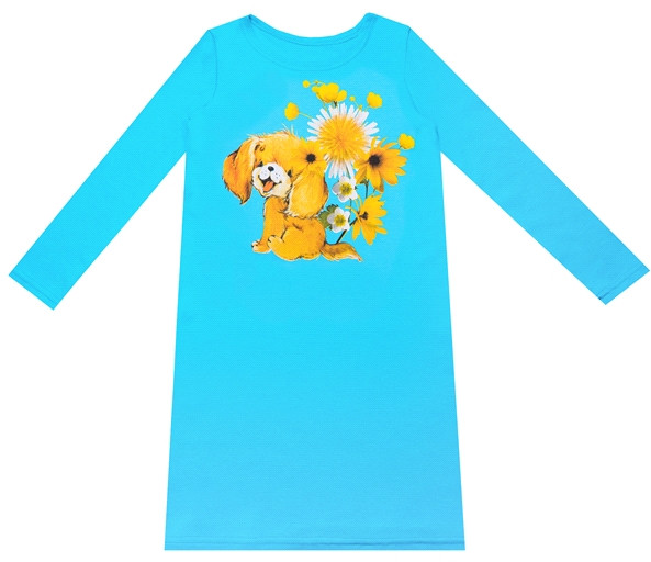 Домашнее платье для девочки выполнено из плотного хлопкового полотна. Изделие с длинными рукавами, украшено дизайнерским принтом «Щенок в цветах». Отличный вариант для сна и отдыха!