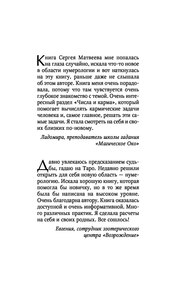 Совсем не то, что ожидала. Автор не хотел себя утруждать описанием нумерологических расчетов, поэтому в книге этого нет. Он рассказывает о значениях чисел, о буквенных значениях в именах, о том, какая буква соотносится с каким числом... О Пифагорской методике по сути написано на пол странички. Думаю, книга будет интересна тем, кто очень давно увлекается нумерологией, знает и владеет разными расчетами, и просто хочет дополнить свои знания ещё чем-то... Для тех, кто только начинает разбираться в этой науке книга будет бесполезна. Магазину и курьеру 5! Автору книги - поменять название, типа - дополнение к нумерологическим знаниям.