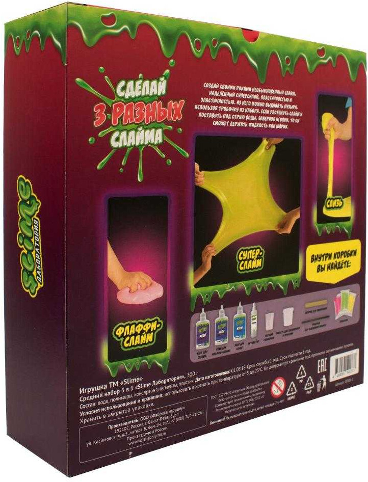 Slime Набор средний 3 в 1 «Сделай 3 разных слайма»В данный момент этот товар отсутствует в продаже. Возможно, у нас найдется аналогичный или похожий товар здесь. Серия: Лаборатория Набор «Slime Лаборатория» позволяет cделать 3 гигантских смайла. С помощью специальной палочки можно выдувать пузыри. Для смешивания ингредиентов слайма в наборе есть специальная емкость, в которой впоследствии можно хранить слайм. |
