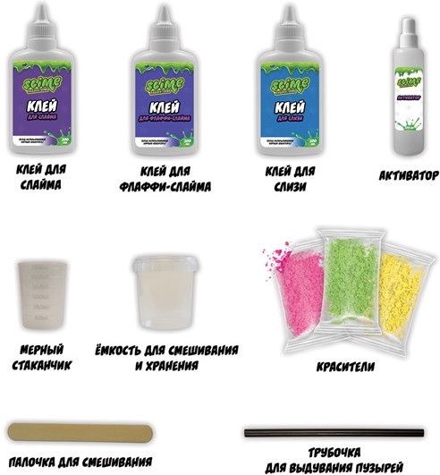 Слайм набор не входят блестки, шарики, звездочки, красители уже имеют приятный запах, ну в целом понравился слайм, детям нравится. Спасибо.