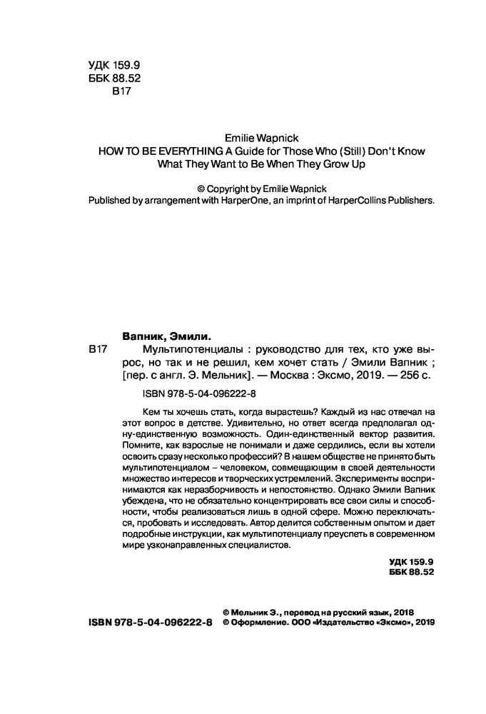 Мультипотенциалы. Руководство для тех, кто уже вырос, но так и не решил, кем хочет статьВ данный момент этот товар отсутствует в продаже. Возможно, у нас найдется аналогичный или похожий товар здесь. Серия: Это взрослая жизнь, детка! Книги для тех, у кого все впереди Зачем проживать одну жизнь, если можно прожить несколько? Как? Например, попробовать свои силы в тех сферах, которые давно манили. Именно так поступают мультипотенциалы — люди, чьи профессиональные интересы могут охватывать музыку, кулинарию и даже физику нейронных звезд! Несмотря на расхожее мнение о том, что мастерства можно добиться лишь на одном-единственном поприще, мультипотенциалы глубоко погружаются в самые разные сферы деятельности и преуспевают в каждой из них. |
