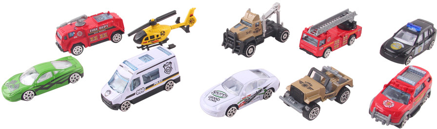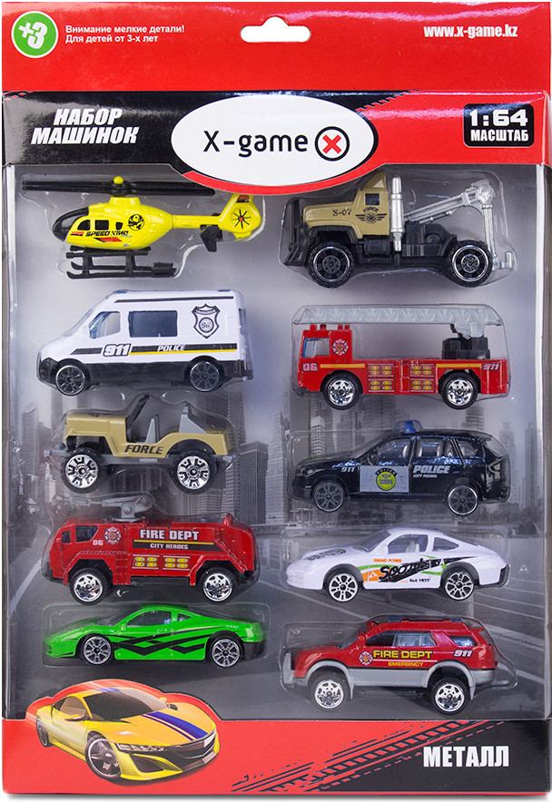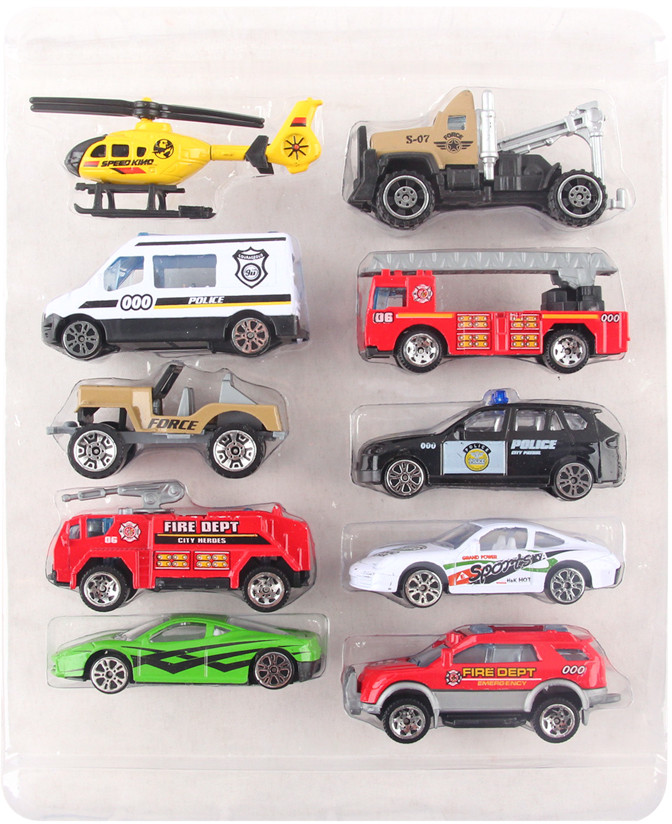Набор интересен тем, что в него входят модели машин разных служб: 2 полицейские, 3 пожарные, 2 военные (джип и эвакуатор), а также 2 спортивные машины и вертолёт. Модели изготовлены из металла и пластика, имеют металлические корпуса. У некоторых машин сделано внутреннее устройство салона.