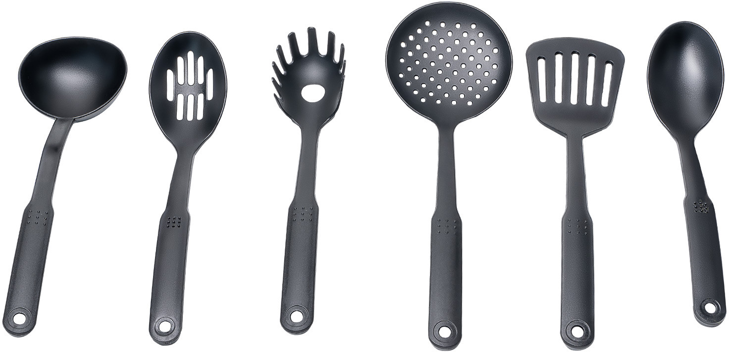 В наборе: лопатка перфорированная, шумовка, половник, ложка перфорированная, ложка поварская, ложка для спагетти.