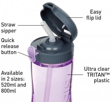 Размер идеальный, удобная защелка, трубочка. Единственный минус - вода проливается, если наклонить бутылку, допустим в сумке или рюкзаке. Не льется водопадом, но протекает.
