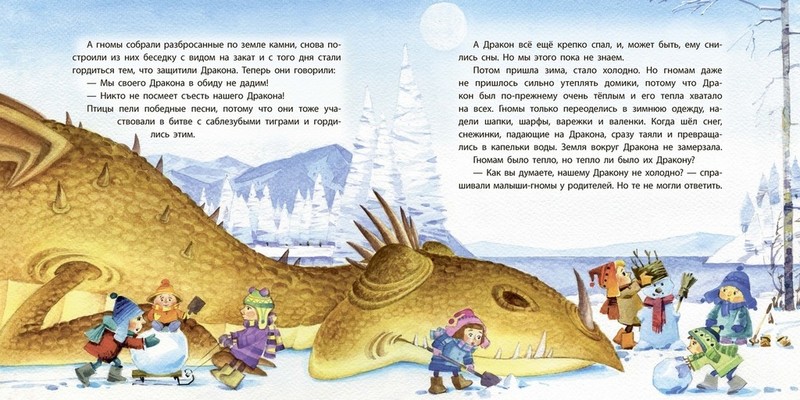 Они сбились в кучку и стояли тихо-тихо, боясь пошевелиться. Что сделает сейчас их любимый Дракон? Встанет на ноги и сразу растопчет домики? Съест самих гномов, потому что сильно проголодался? Развернет крылья, встряхнется после долгого сна, и птичьи гнезда посыплются с его спины прямо на землю? Гномы и птицы готовились к самому худшему...