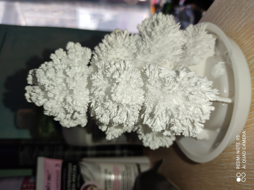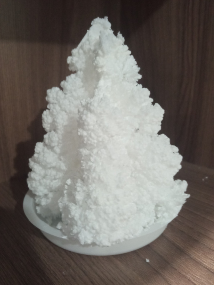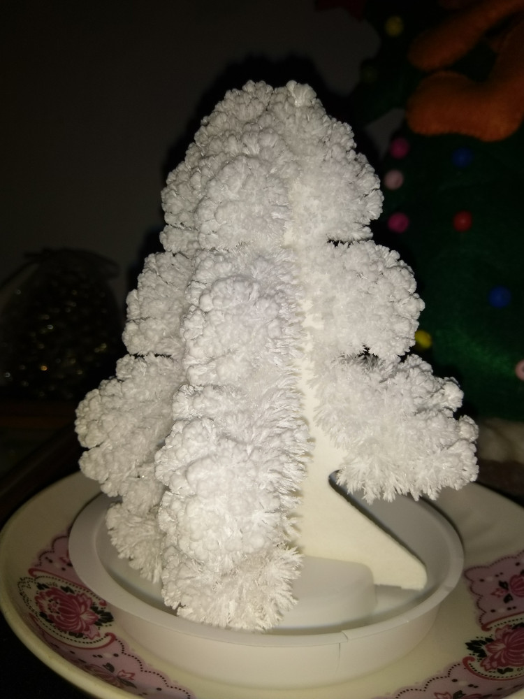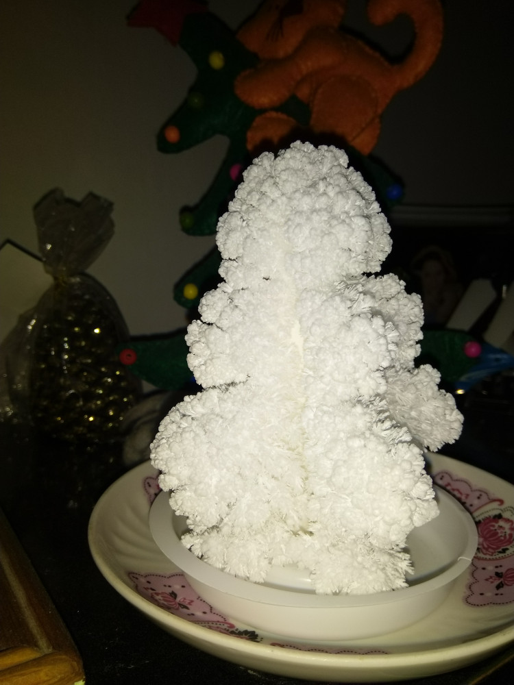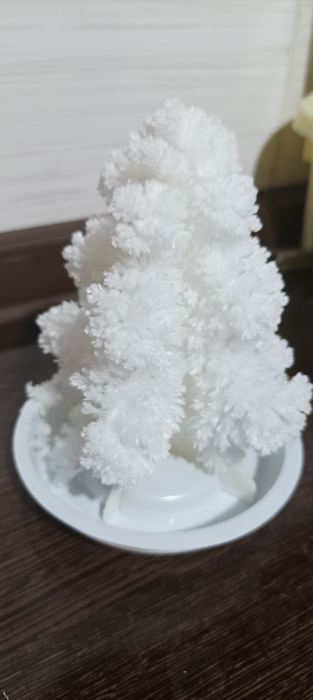 Ёлочка выросла часа за три. Детям было интересно наблюдать за "волшебством". На третий день стала сильно осыпаться, так как кристалы хрупкие очень, пришлось выбросить.