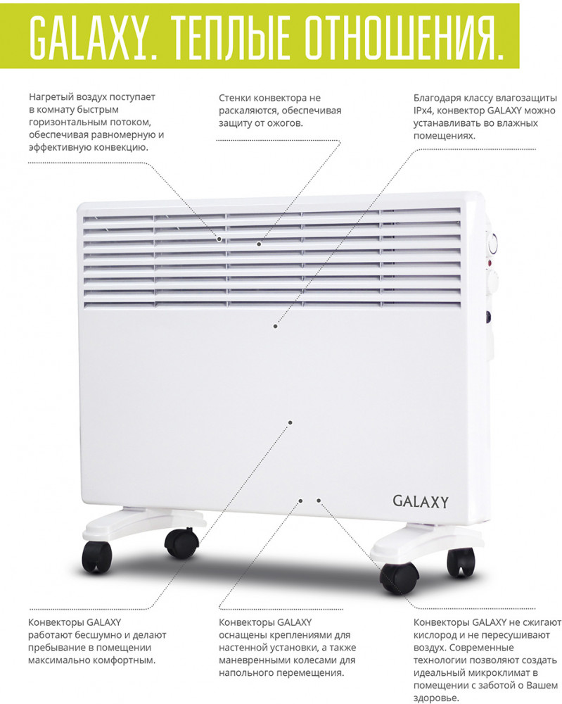 Galaxy Обогреватель конвекционныйВ данный момент этот товар отсутствует в продаже. Возможно, у нас найдется аналогичный или похожий товар здесь. 4-х секционный обогреватель Galaxy GL8227 основан на принципе естественной конвекции, что обеспечивает равномерный и быстрый прогрев отапливаемого помещения. Очевидным преимуществом электрического конвектора является отсутствие прямого контакта нагревательного элемента с воздухом (он изолирован внутри радиатора-теплообменника). Холодный воздух естественным путем циркулирует вдоль теплообменника и, нагреваясь, отдает тепло помещению, после чего начинает новый цикл циркуляции. |