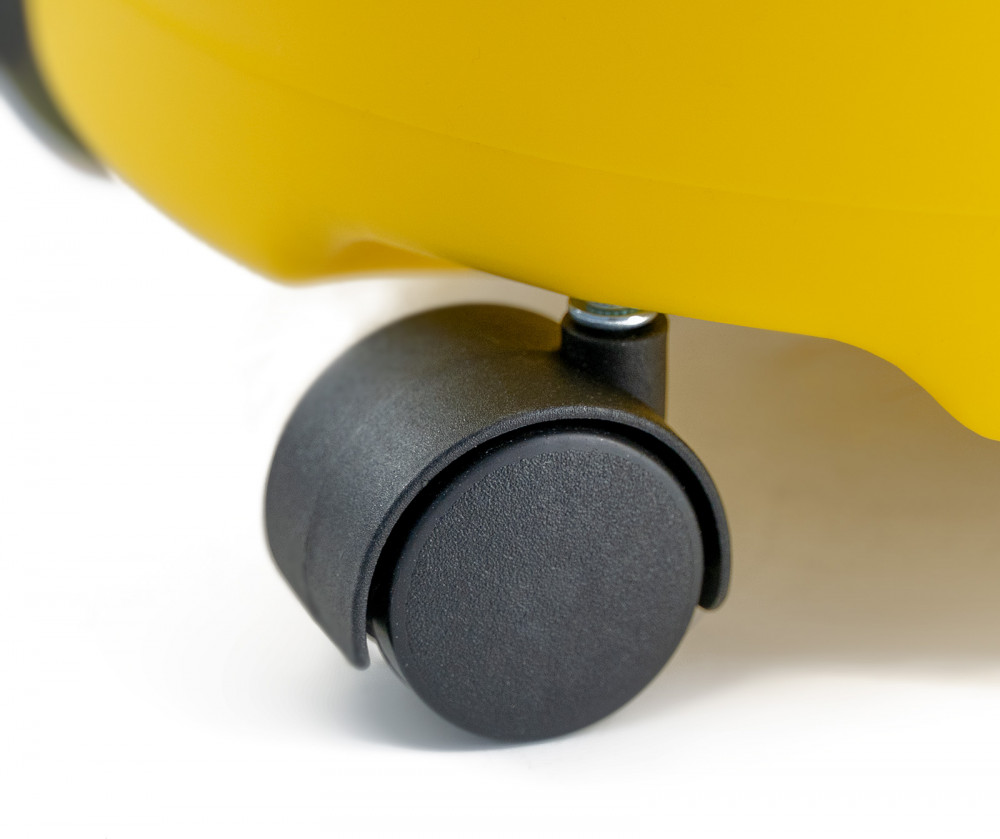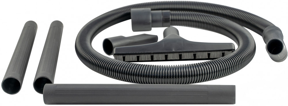 Комплектация: шланг гофрированный 1,5 м, труба трехсекционная, насадка для пола, щелевая насадка, тканевый фильтр, колесо — 4 шт.