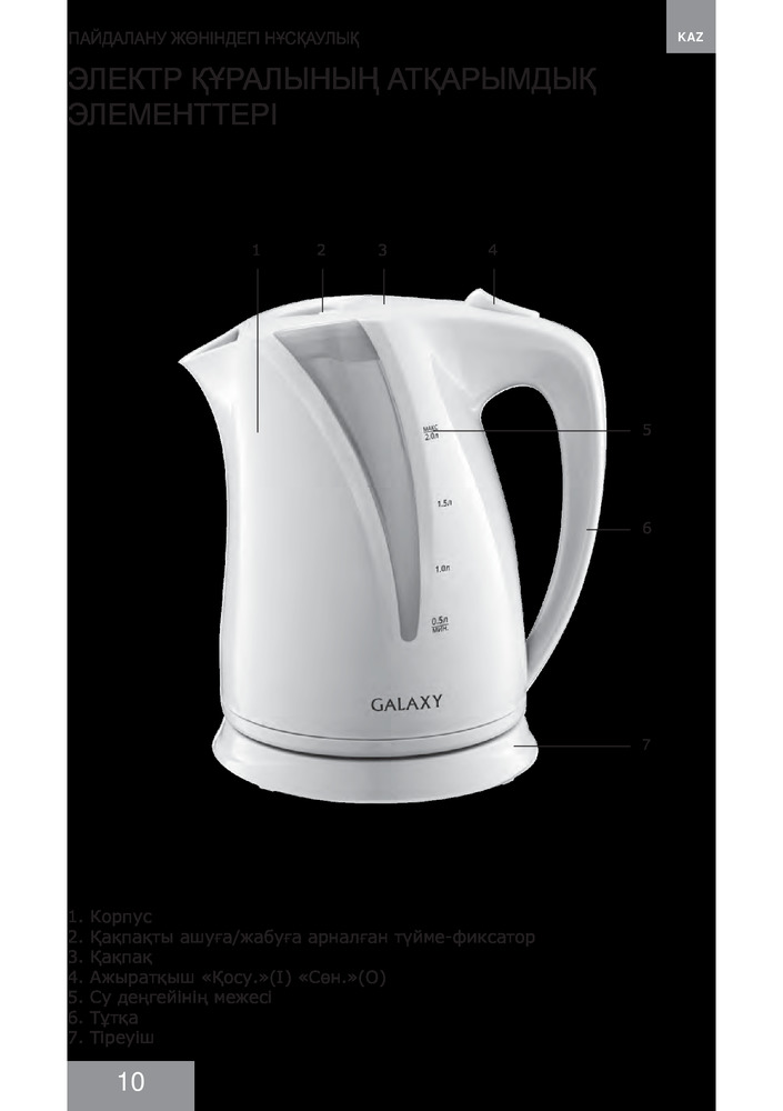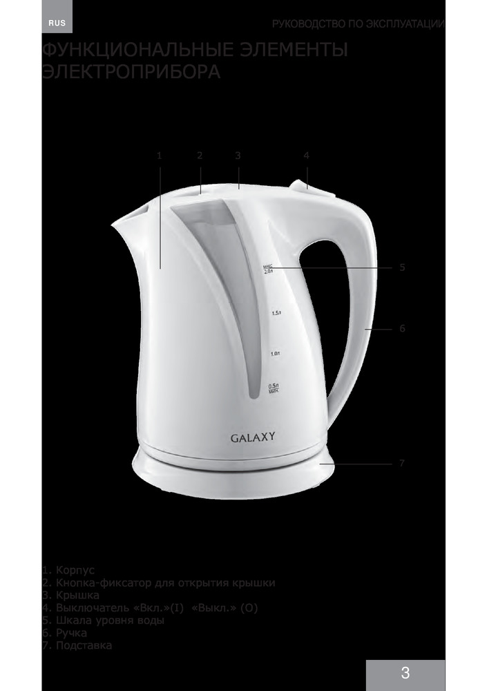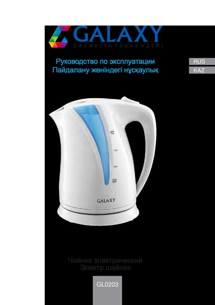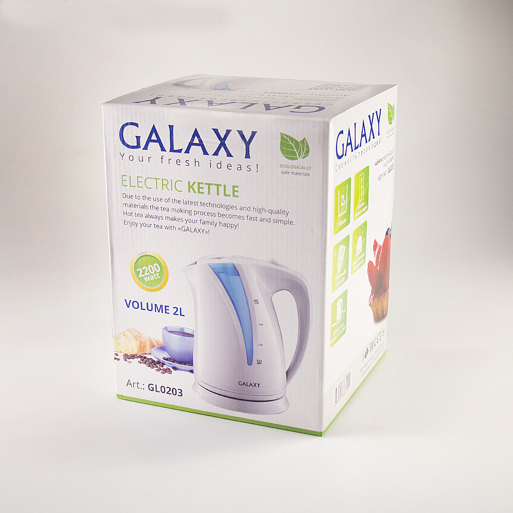 В конструкции Galaxy GL 0203 присутствует закрытая спираль, которая служит нагревательным элементом. В носике электрического чайника имеется фильтр для очищения воды от накипи. Материалом изготовления корпуса послужил пластик без токсичных веществ в составе, благодаря чему вкус воды не будет портиться.