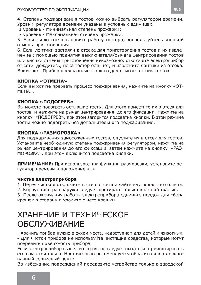 Функция автоматического центрирования обеспечивает равномерное поджаривание тостов с двух сторон вне зависимости от толщины ломтиков, а также исключает возможность пригорания. Регулятор времени приготовления позволит вам выбрать степень зажарки тостов, а кнопка отмены приготовления — прервать обжаривание при необходимости.