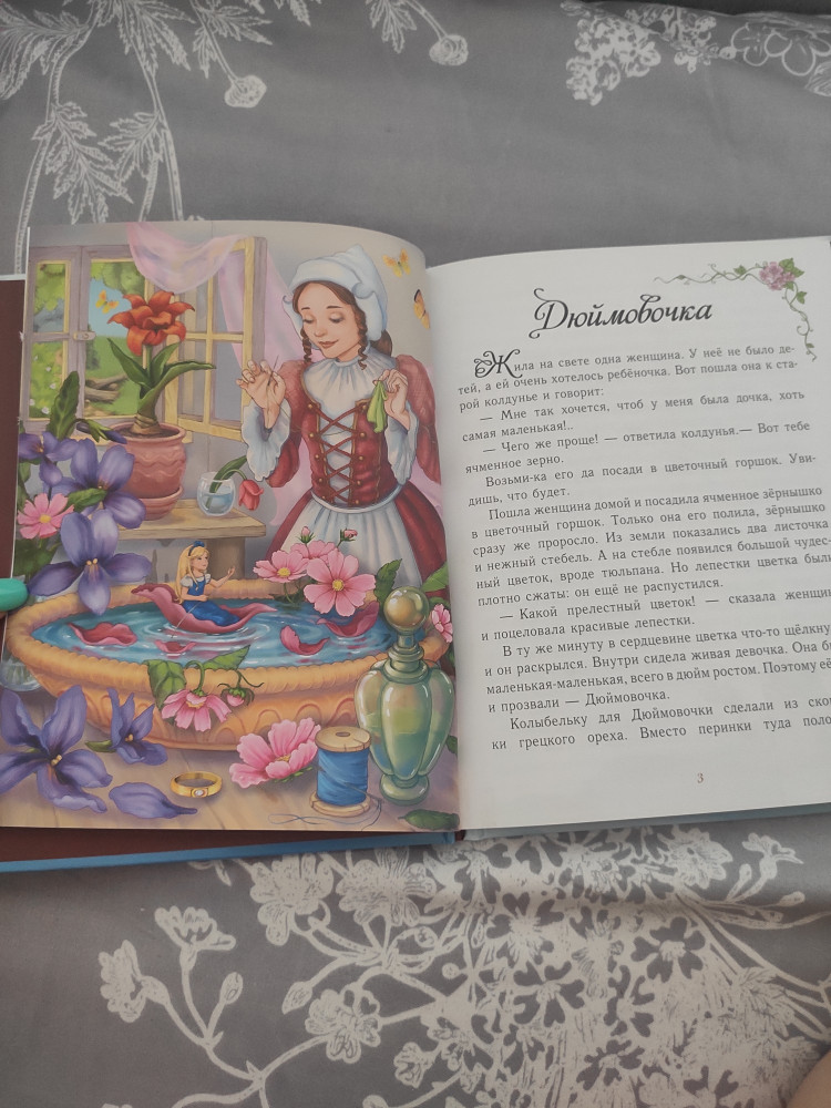 В книге 3 сказки: дюймовочка, гадкий утёнок и огниво. приятная выбеленная бумага, яркие картинки. качеством очень довольна!
