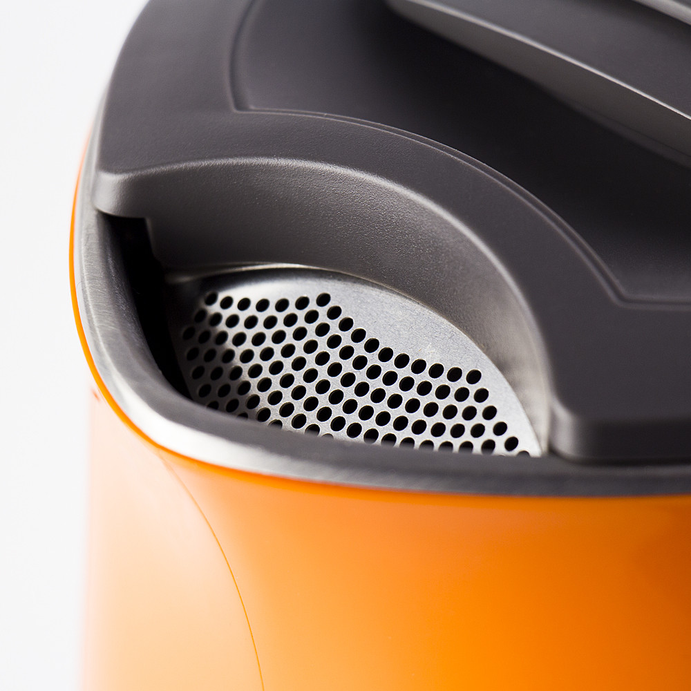 внешняя выполнена из экологически безопасного пищевого пластика, внутренняя — из нержавеющей стали марки 18/10. Благодаря такой конструкции наружная поверхность чайника не нагревается, о него невозможно обжечься, устройство издает меньше шума при нагреве воды.