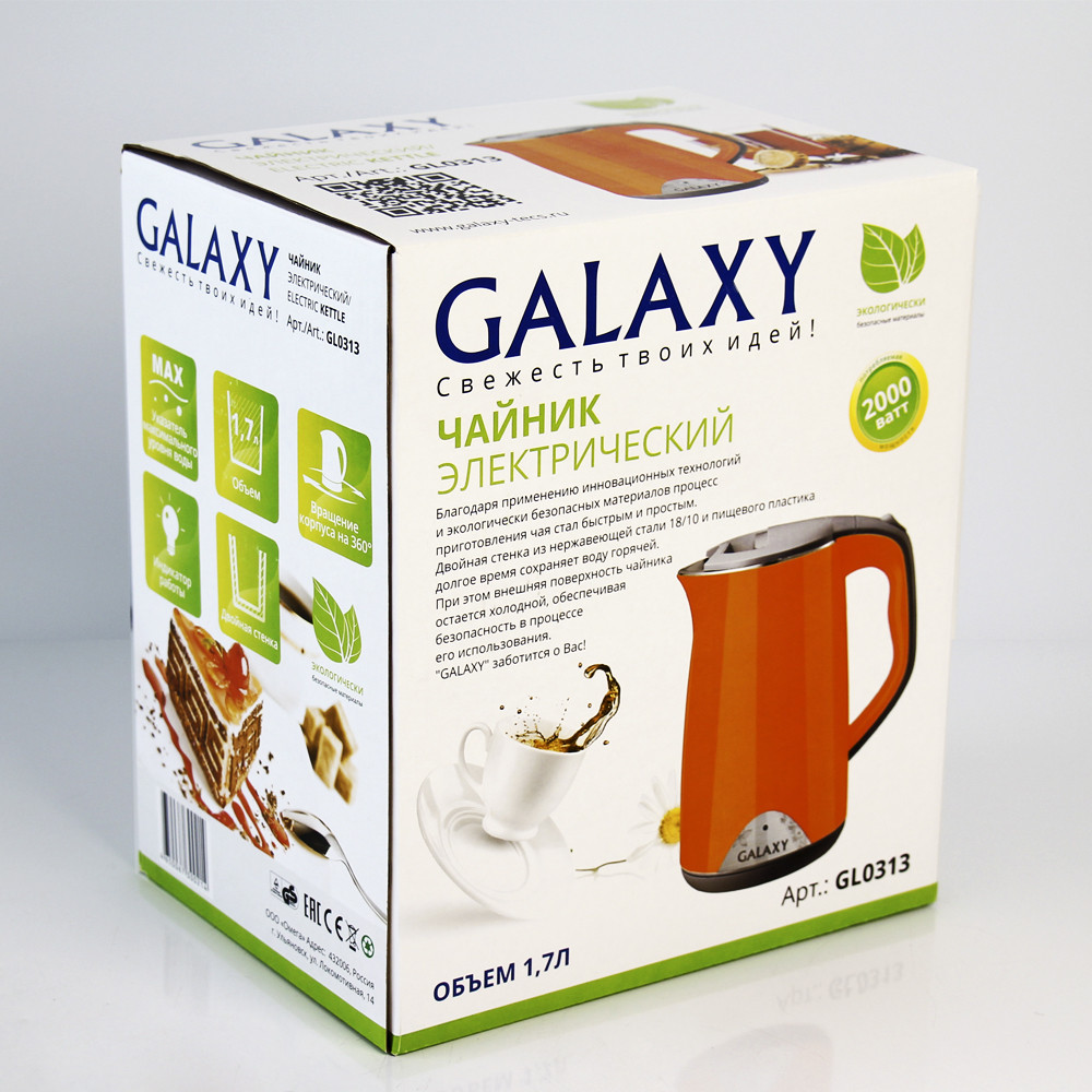 Чайник электрический Galaxy GL0313 имеет элегантную форму, эргономичную ручку и двойные стенки,