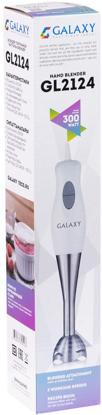 Galaxy Блендер погружной GL-2124В данный момент этот товар отсутствует в продаже. Возможно, у нас найдется аналогичный или похожий товар здесь. Нужно быстро приготовить коктейль, смузи, соус? А может, сделать суп-пюре? Используйте погружной блендер Galaxy GL 2124. Компактный и легкий прибор не зря называется ручным. Его нетрудно удерживать в одной руке, работая над приготовлением того же соуса или супа-пюре прямо в миске или кастрюле. За скорость обработки продуктов отвечает мотор мощностью (300 Вт), который эффективно раскручивает ножи из нержавеющей стали в двух скоростных режимах. Вращающийся шнур не скручивается во время работы блендером.ния и мерного стакана. |