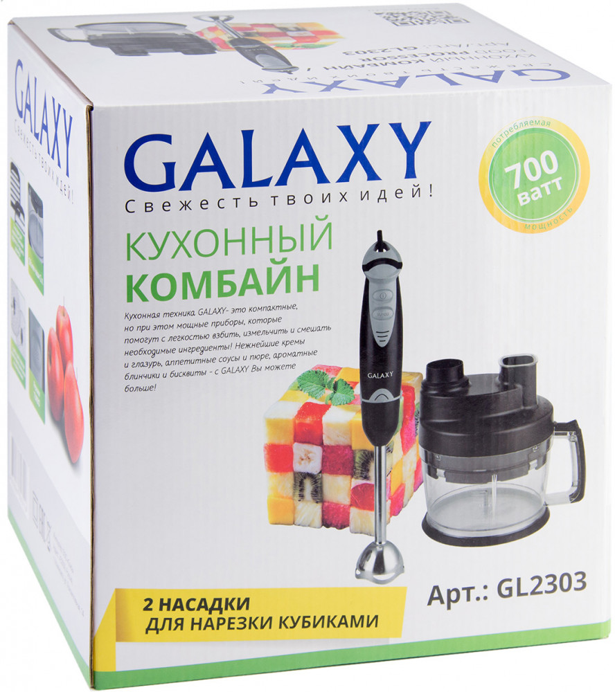 Galaxy Кухонный комбайн GL2303В данный момент этот товар отсутствует в продаже. Возможно, у нас найдется аналогичный или похожий товар здесь. Комбайн Galaxy GL2303 мощностью 700 Вт и большой пластиковой чашей объемом 2л. — незаменимый помощник на вашей кухне. Работает в «Turbo» режиме, что позволяет измельчать особо твердые продукты. В комплект входит насадка-блендер, благодаря которой вы сможете взбивать кремы, готовить соусы и коктейли. Очевидным преимуществом модели Galaxy GL2303 является наличие двух насадок для нарезки кубиками, что позволит вам быстро готовить салаты, нарезая овощи крупными или мелкими кубиками. Кухонный комбайн имеет стильный дизайн и прорезиненное основание, которое препятствует скольжению и надежно фиксирует прибор на рабочей поверхности. |
