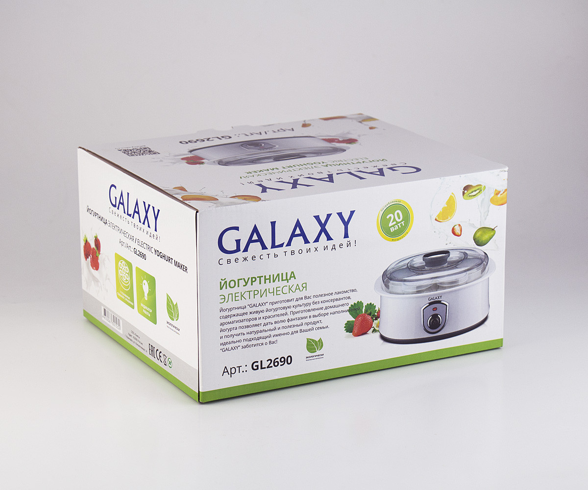 Galaxy Йогуртница GL2690В данный момент этот товар отсутствует в продаже. Возможно, у нас найдется аналогичный или похожий товар здесь. Электрическая йогуртница Galaxy GL2690 поможет вам самостоятельно приготовить «живой» (термостатный) йогурт, а также кефир или сметану. Принцип работы йогуртницы заключается в следующем: молоко смешивается с закваской. Затем смесь разливается в емкости йогуртницы. 7 стеклянных стаканчиков идут в комплекте с йогуртницей Galaxy GL2690. Стаканы и их содержимое медленно подогреваются при температуре примерно 40-45 ºС до готовности продукта и прибор автоматически отключается. Хранится такой натуральный йогурт без консервантов и красителей не более 10 дней. Модель Galaxy GL2690 мощностью 20 Вт позволит вам сэкономить на электроэнергии. |