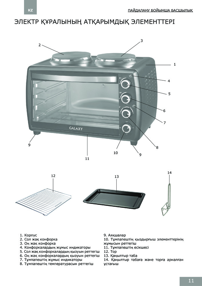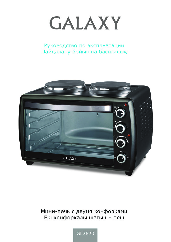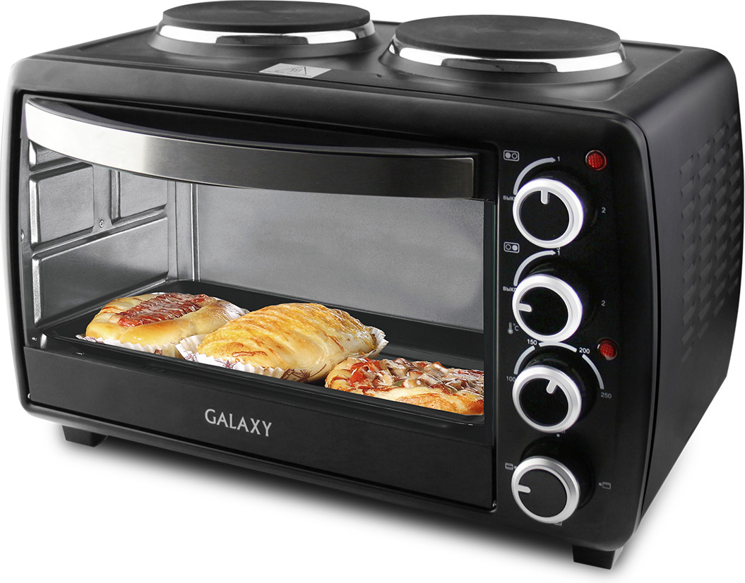 Мини-печь с двумя конфорками Galaxy GL2620 — это полноценная электроплита. Духовой шкаф мини-печи имеет большой объем 50 литров и оснащен четырьмя нагревательными элементами: 2 сверху и 2 снизу, которые могут работать как по отдельности, так и вместе. Например, для приготовления барбекю рекомендуется использовать верхние нагревательный элементы, для выпечки — нижние, а для запекания — все нагревательные элементы одновременно. Мощность печи 1650 Вт, мощность комфорки 1000 Вт, правой 850 Вт. Мини-печь с двумя конфорками Galaxy GL2617 полностью заменяет электроплиту, микроволновку, гриль, тостер и духовку! В комплект входят решетка и противень.