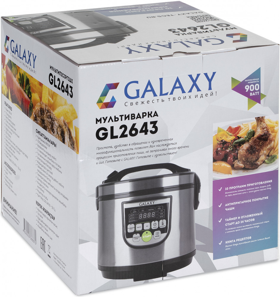 Мультиварка Galaxy GL2643 имеет все необходимые функции для комфортного приготовления. 10 программ позволят готовить без вашего контроля каши, крупы, супы, тушить овощи, готовить мясо, рагу, холодец, плов и мн. др. Мультиварка сможет разнообразить ваше меню блюдами, приготовленными на пару или в собственном соку без капли жира. Если вы придерживаетесь правильного питания или планируете сбросить вес, такая «умная помощница» поможет быстрее добиться нужного результата. Данная модель имеет ряд очевидных преимуществ. Функция отложенного старта до 24 часов позволит вам не тратить время на приготовление завтрака по утрам. Все, что вам нужно — это наполнить чашу и запустить нужную программу с вечера. Автоматическая функция поддержания температуры позволяет долго сохранять оптимальную температуру готового блюда. Система равномерного нагрева особенно актуальна для выпечки и сложных блюд.