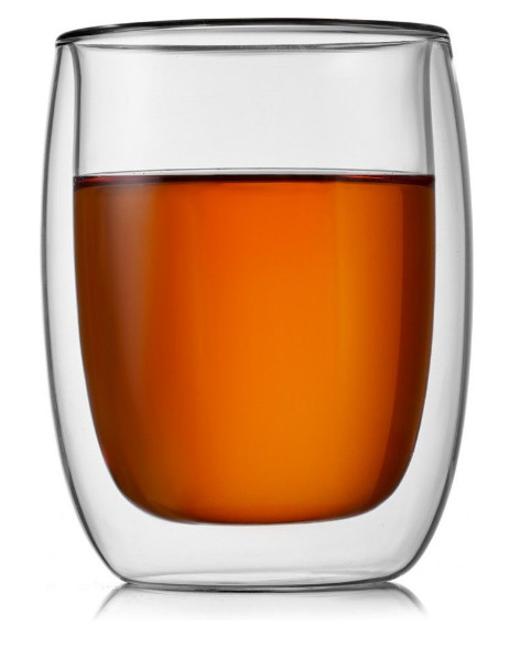 Бокалы имеют две стенки, между которыми находится прослойка воздуха. Благодаря этому внешняя стенка бокалов всегда прохладная, даже если она наполнены кипятком. Если в бокале холодный напиток, на стенках не выступит конденсат, а значит ваш стол будет застрахован от появления мокрых пятен.