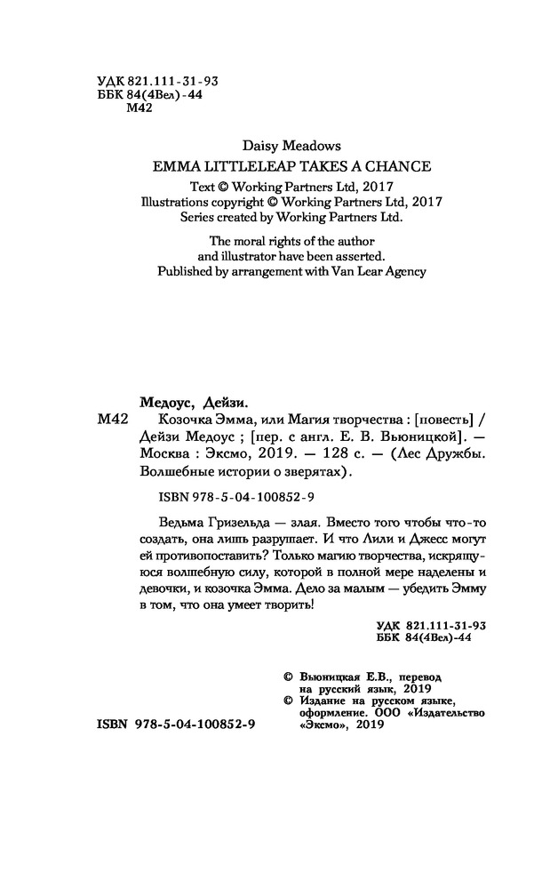 Козочка Эмма, или Магия творчестваВ данный момент этот товар отсутствует в продаже. Возможно, у нас найдется аналогичный или похожий товар здесь. Серия: Лес Дружбы. Волшебные истории о зверятах Ведьма Гризельда — злая. Вместо того, чтобы что-то создать, она лишь разрушает. И что Лили и Джесс могут ей противопоставить? Только магию творчества, искрящуюся волшебную силу, которой в полной мере наделены и девочки, и козочка Эмма. Дело за малым — убедить Эмму в том, что она умеет творить! |
