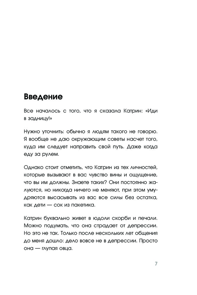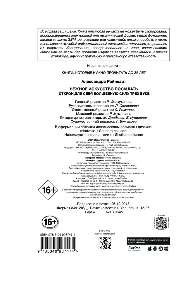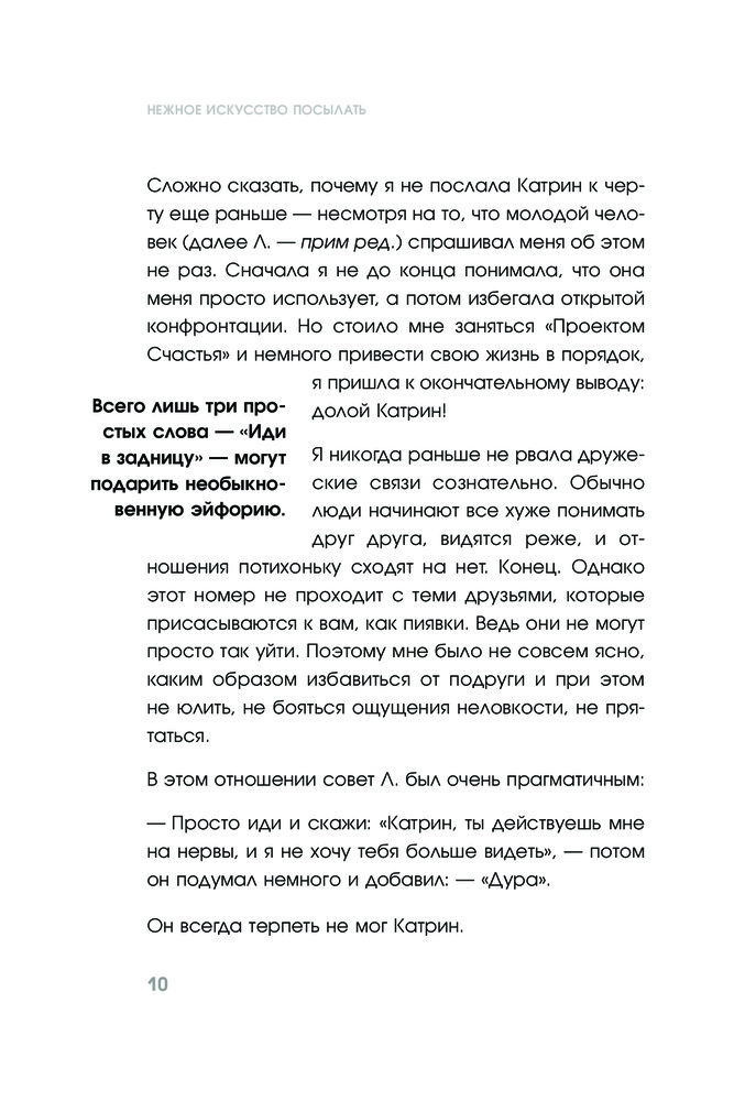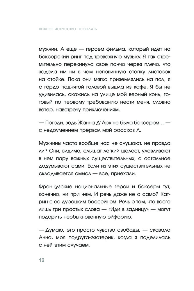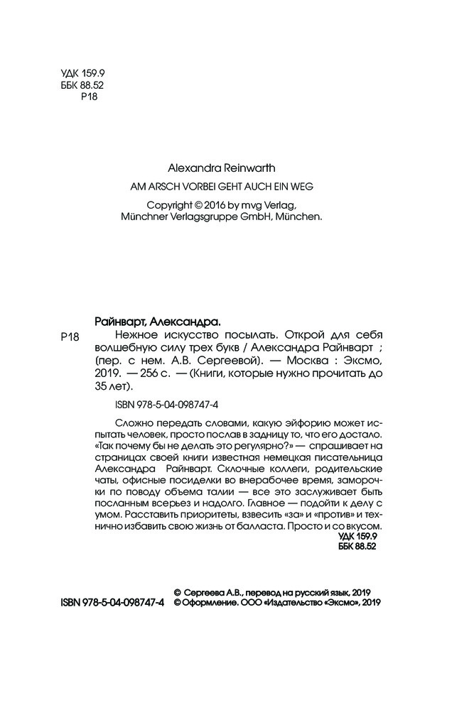 Нежное искусство посылать. Открой для себя волшебную силу трех буквВ данный момент этот товар отсутствует в продаже. Возможно, у нас найдется аналогичный или похожий товар здесь. Серия: Книги, которые нужно прочитать до 35 лет Кого из нас время от времени не посещает ощущение: «надо что-то менять». В такой момент рука непроизвольно тянется к книгам по саморазвитию, курсор щелкает по ссылкам на сайты лайфкоучей, а в голову то и дело закрадываются мысли о зверских диетах и пластических хирургах. Но вот вопрос: сделают ли вас счастливее такого рода изменения? Александа Райнварт — автор целой серии немецких бестселлеров по саморазвитию — утверждает: не редко «надо что-то менять» означает «нужно кого-то или чего-то послать». Причем, от души, не стесняясь в выражениях и не тратя время на размышления. Это могут быть токсичные люди, выматывающие ситуации, дурацкие убеждения, корпоративные вечеринки, заморочки по поводу объема талии, родительские чаты, сожаления, обиды и страхи. Главное — вычислить, что конкретно мешает вам ощущать радость бытия, и с носка отправить «отравитель жизни» куда подальше. Казалось бы, все просто, но на деле приходится освоить некоторое количество методик и схем, чтобы делать это экологично, без вредя для себя и окружающих. |