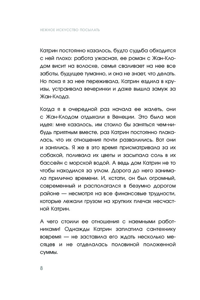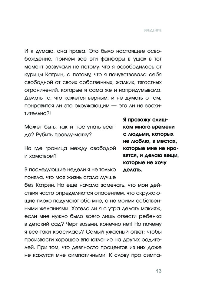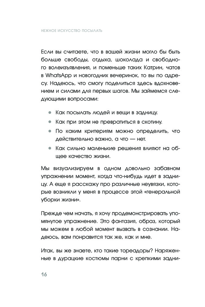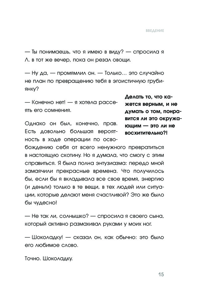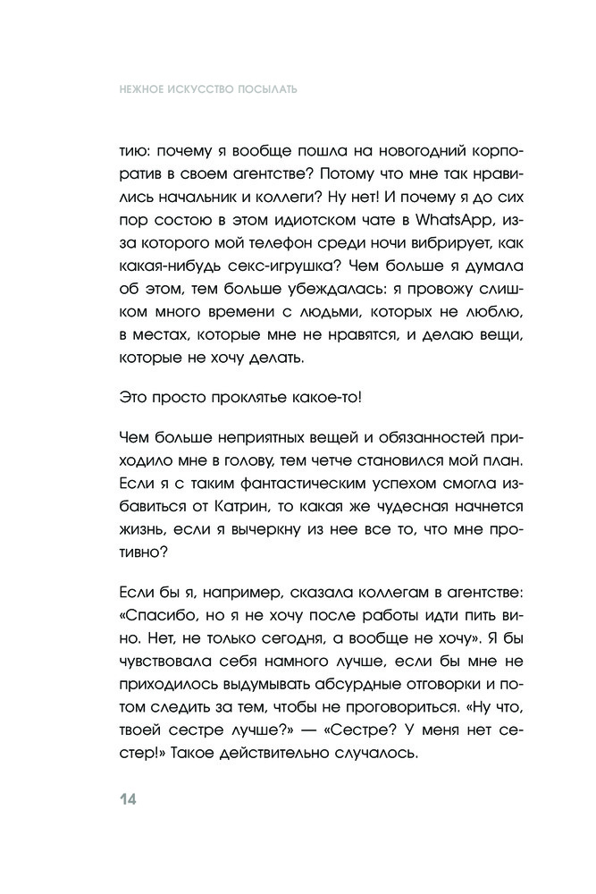 Книга очень понравилась. Жаль нас этому не учат с детства, посылать все что не важно и не нужно куда подальше. Потом вырастаем и так и живём с желанием всем понравится, быть удобными и хорошими для других. Ещё до окончания книги выкинула то что раньше все откладывала и жалко было выкинуть по разным причинам, чей-то подарок вещи которые уже не ношу, но все зачем то хранила.