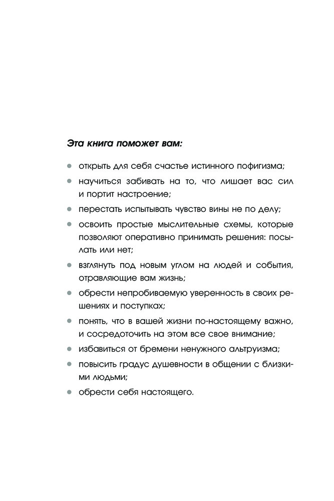 Рассказ ленивой женщины в трениках , которая всю жизнь готова лежать на диване, но ей постоянно кто-то мешает. Единственное что интересное в этой книге-это введение, но его можно прочесть на этой странице. Никому не советую эту книгу. Про пофигизм лучше прочесть что-то другое.