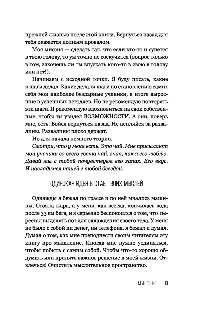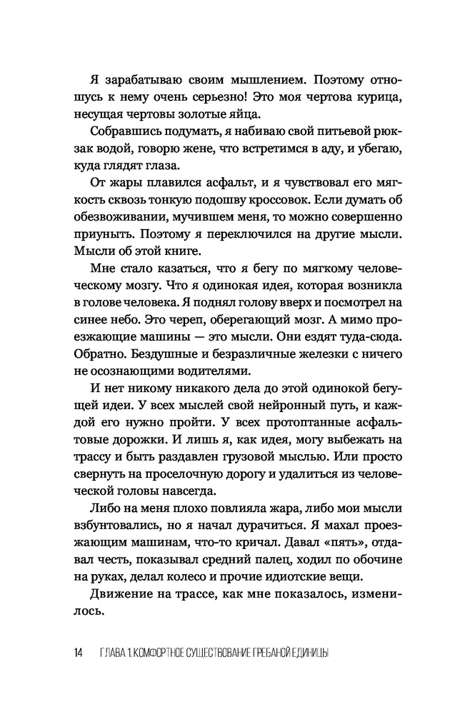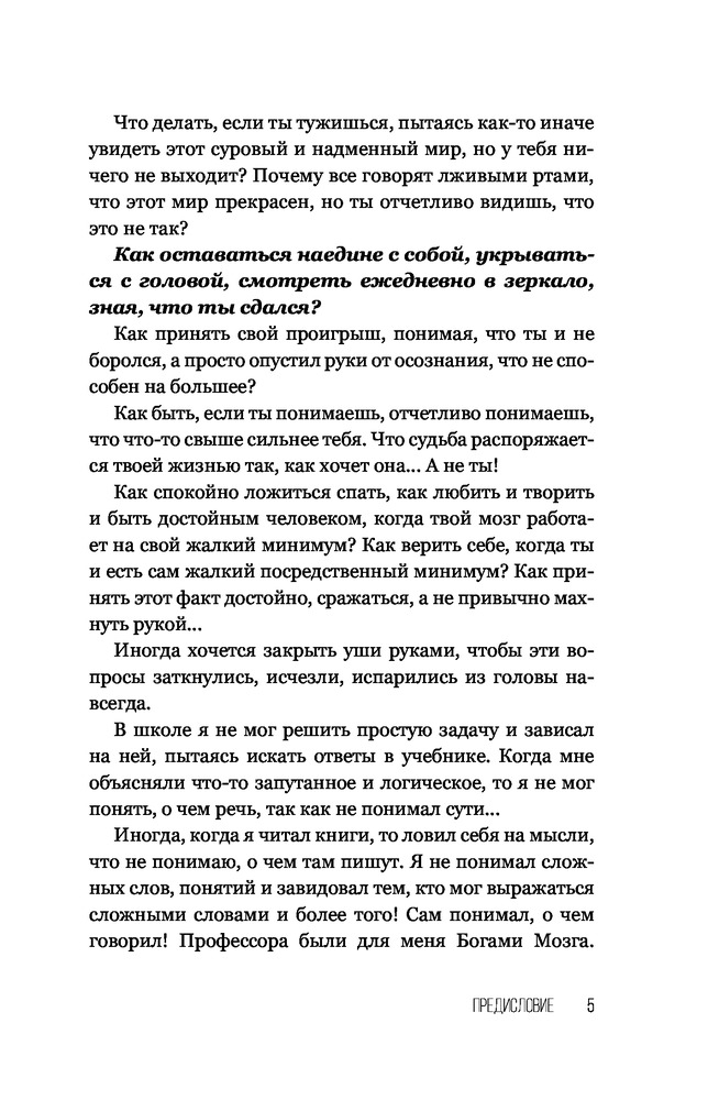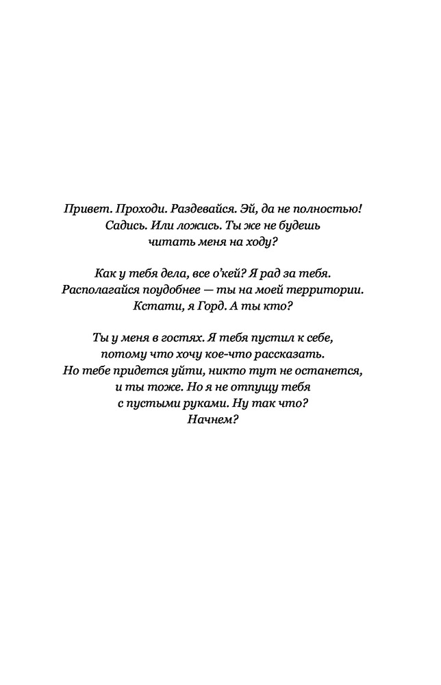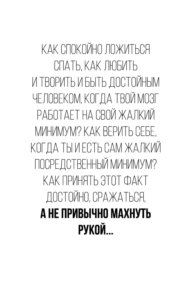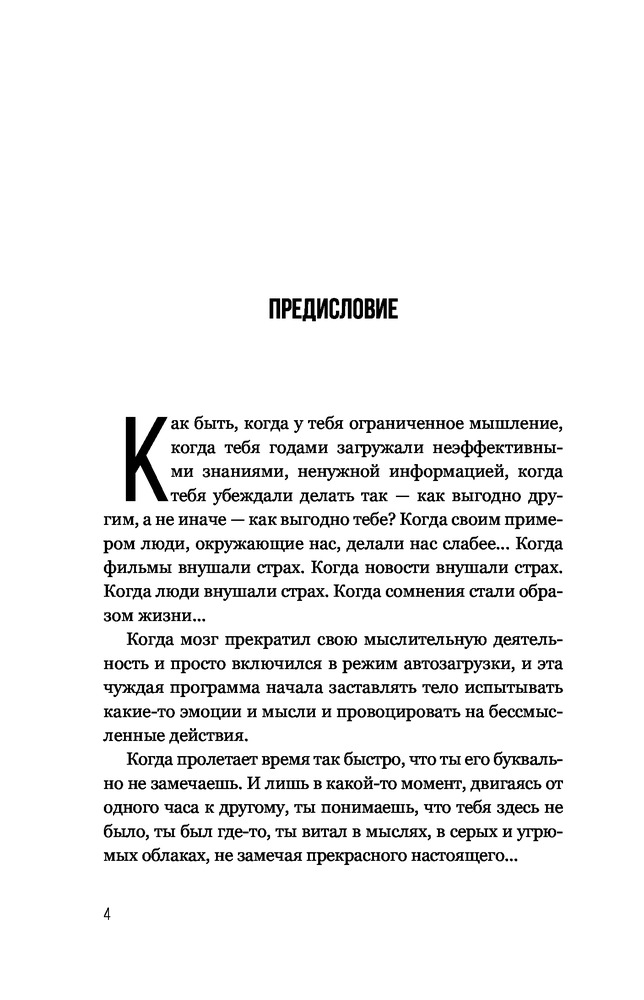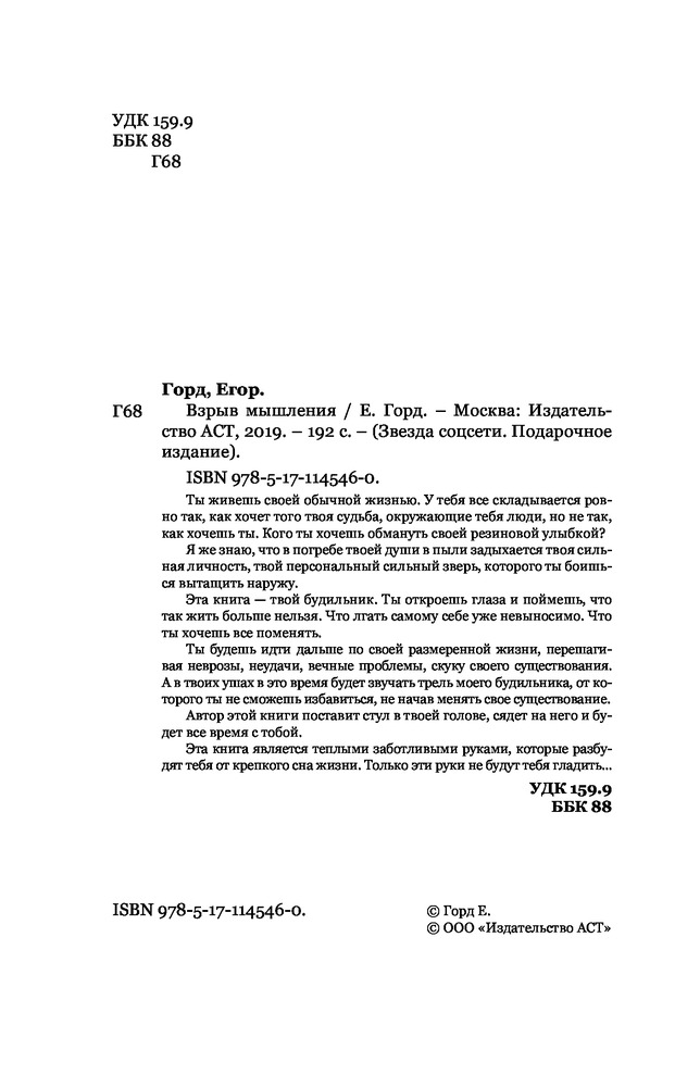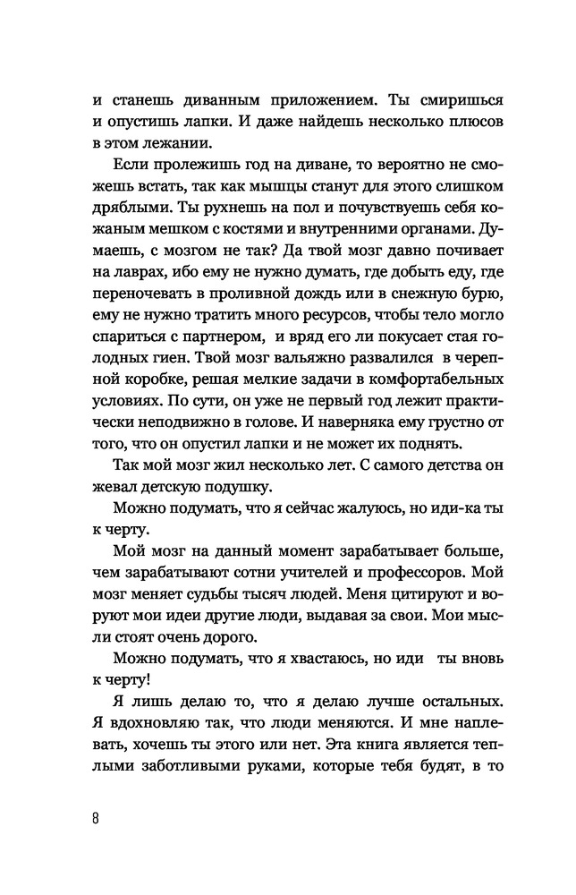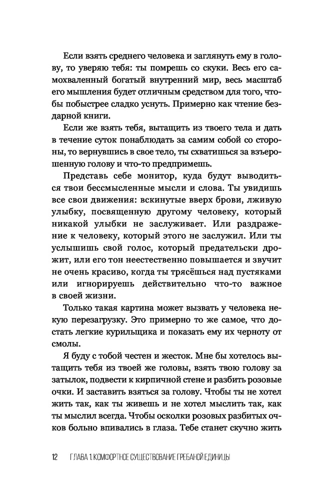 Взрыв мышленияВ данный момент этот товар отсутствует в продаже. Возможно, у нас найдется аналогичный или похожий товар здесь. Серия: Звезда соцсети. Подарочное издание Ты живешь своей обычной жизнью. У тебя все складывается ровно так, как хочет того твоя судьба, окружающие тебя люди, но не так, как хочешь ты. Кого ты хочешь обмануть своей резиновой улыбкой? Я же знаю, что в погребе твоей души в пыли задыхается твоя сильная личность, твой персональный сильный зверь, которого ты боишься вытащить наружу. Эта книга — твой будильник. Ты откроешь глаза и поймешь, что так жить больше нельзя. Что лгать самому себе уже невыносимо. Что ты хочешь все поменять. Ты будешь идти дальше по своей размеренной жизни, перешагивая неврозы, неудачи, вечные проблемы, скуку своего существования. А в твоих ушах в это время будет звучать трель моего будильника, от которого ты не сможешь избавиться, не начав менять свое существование. Автор этой книги поставит стул в твоей голове, сядет на него и будет все время с тобой. Эта книга является теплыми заботливыми руками, которые разбудят тебя от крепкого сна жизни. Только эти руки не будут тебя гладить... |