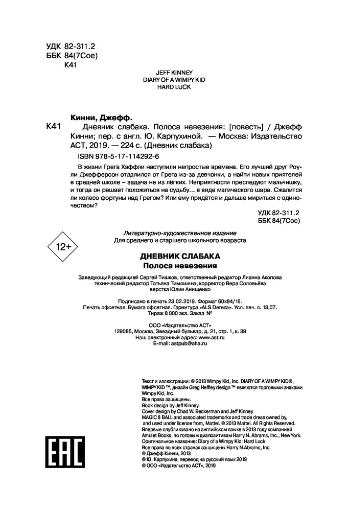 💳 Оплатить за товар можно при получении 🇰🇿 Есть бесплатная доставка по Казахстану от 1 дня 🎁 Копите бонусы с каждой покупки Серия: Дневник слабака В жизни Грега Хэффли наступили непростые времена. Его лучший друг Роули Джефферсон отдалился от Грега из-за девчонки, а найти новых приятелей в средней школе — задача не из лёгких. Неприятности преследуют мальчишку, и тогда он решает положиться на судьбу... в виде магического шара. Сжалится ли колесо фортуны над Грегом? Или ему придётся и дальше мириться с одиночеством? |