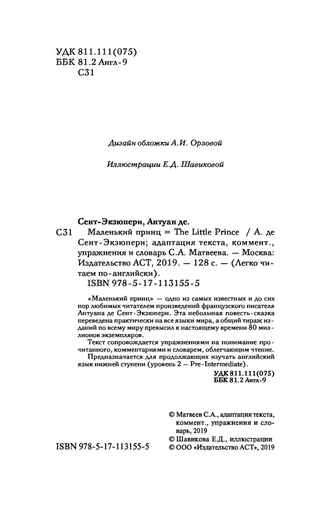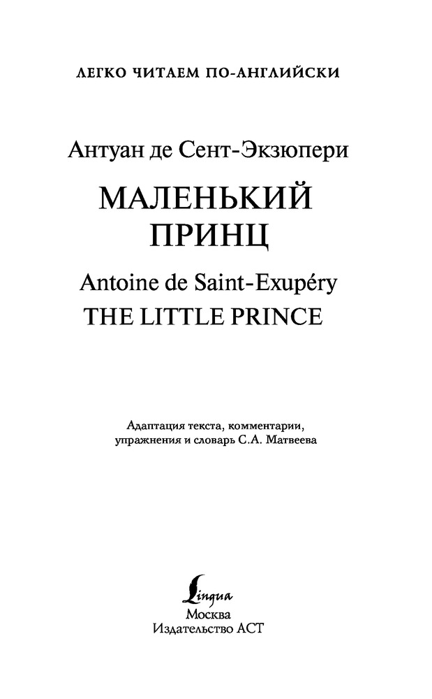 💳 Оплатить за товар можно при получении 🇰🇿 Есть бесплатная доставка по Казахстану от 1 дня 🎁 Копите бонусы с каждой покупки Серия: Легко читаем по-английски «Маленький принц» — одно из самых известных и до сих пор любимых читателем произведений французского писателя Антуана де Сент-Экзюпери. Эта небольшая повесть-сказка переведена практически на все языки мира, а общий тираж изданий по всему миру превысил к настоящему времени 80 миллионов экземпляров. Текст сопровождается упражнениями на понимание прочитанного, комментариями и словарем, облегчающим чтение. Предназначается для продолжающих изучать английский язык нижней ступени (уровень 2 — Pre-Intermediate). |